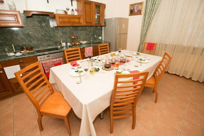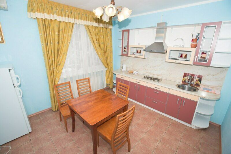 - Прихожая, оборудованная кухня (большой стол, холодильник, плита, духовка, чайник, посуда, кастрюли);