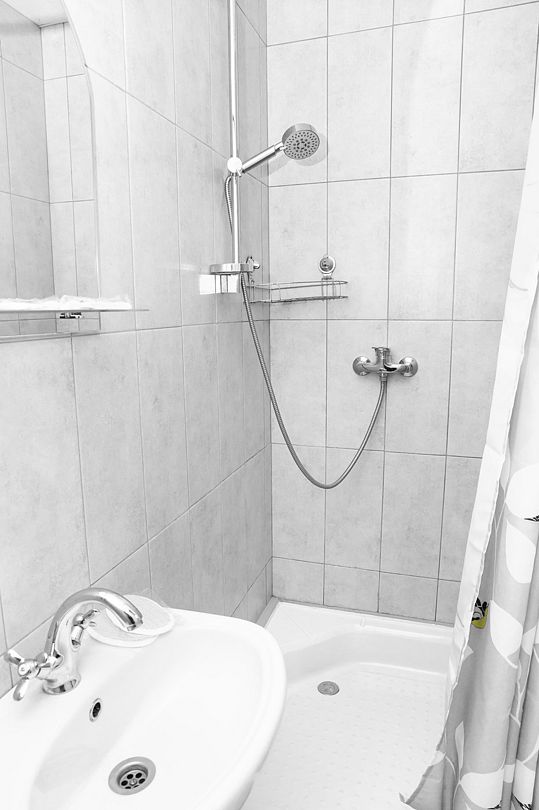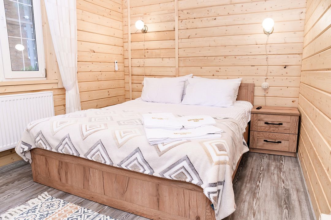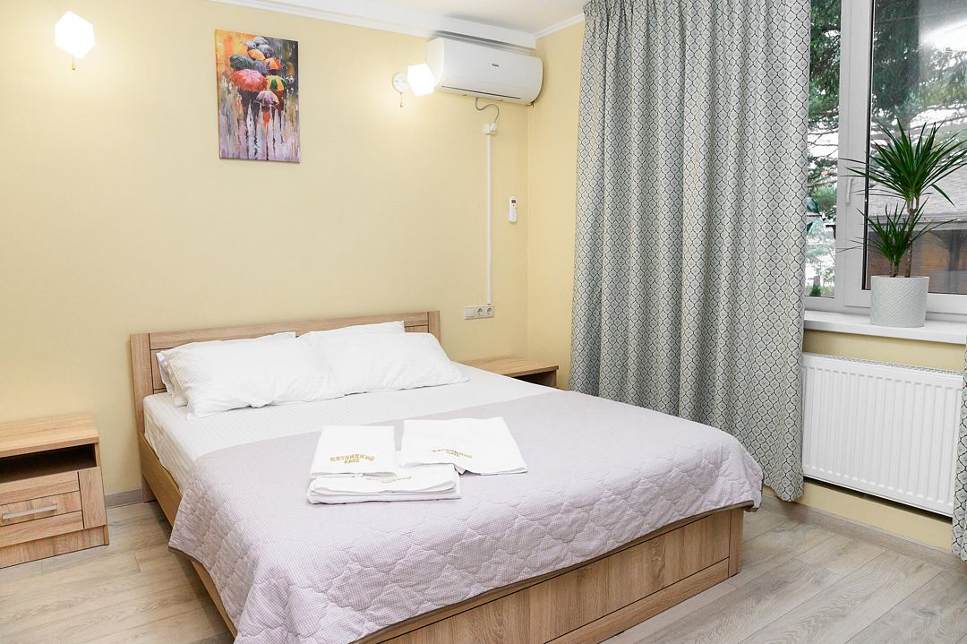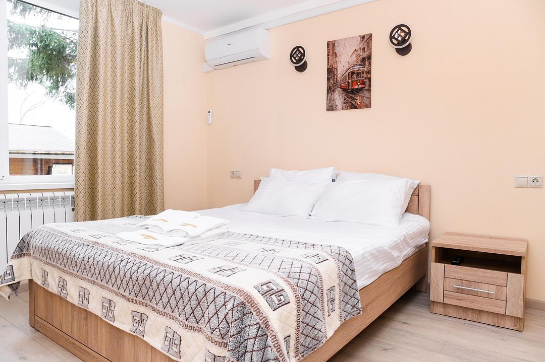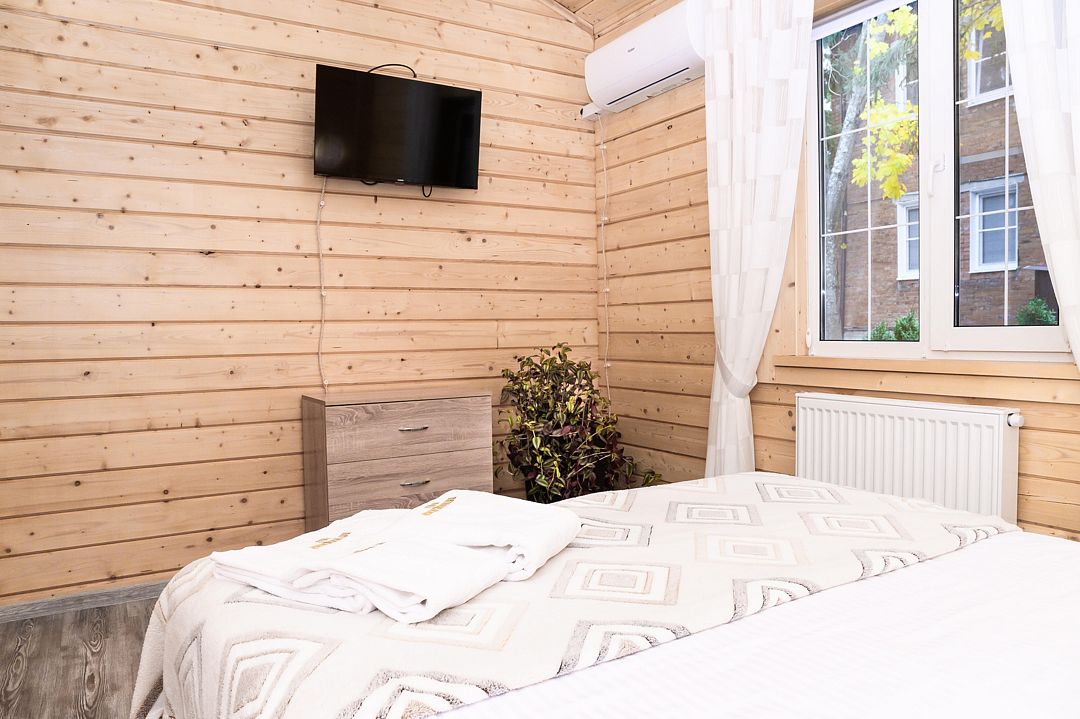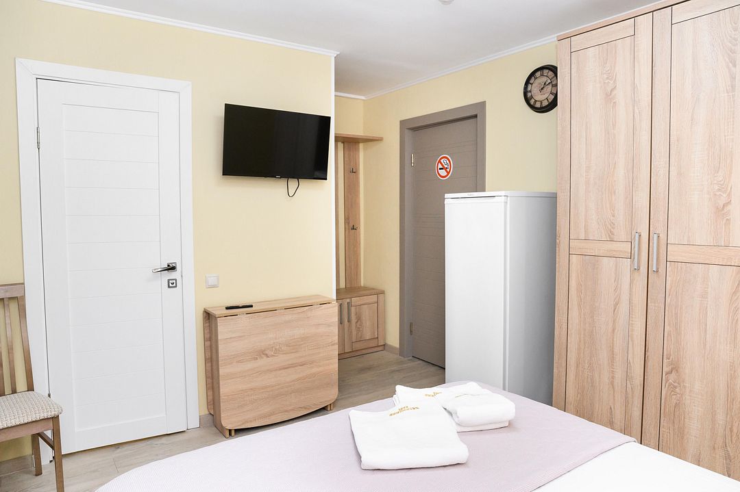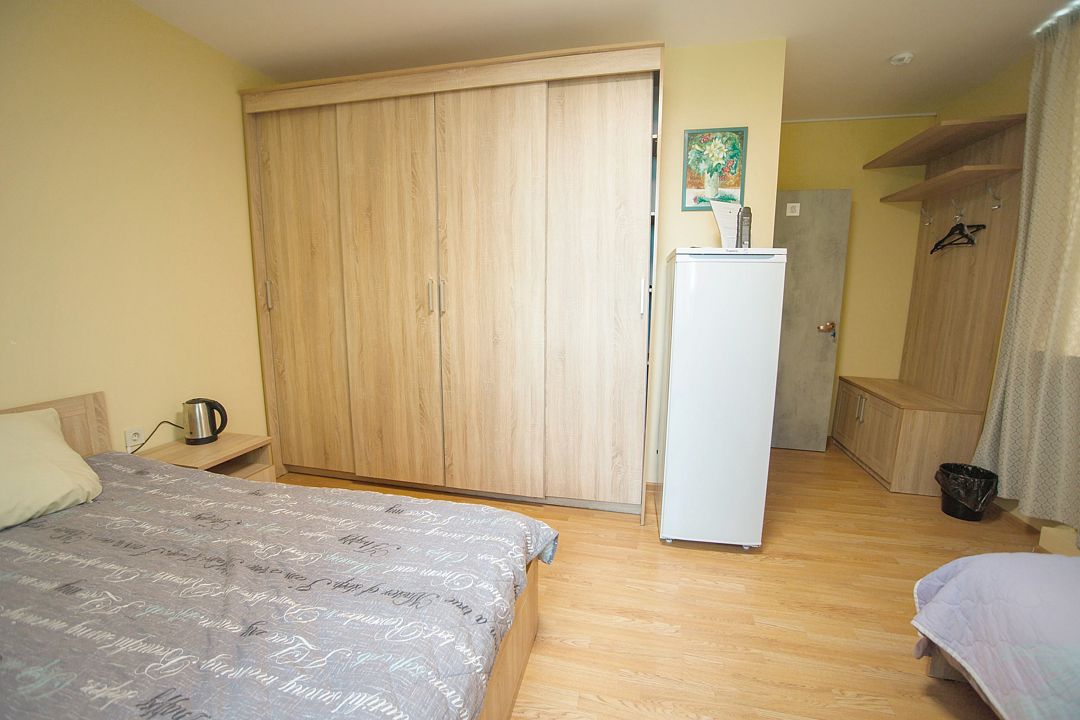 Двухместный стандартный номер с одной двуспальной кроватью и санузлом. Кухня на этаже.