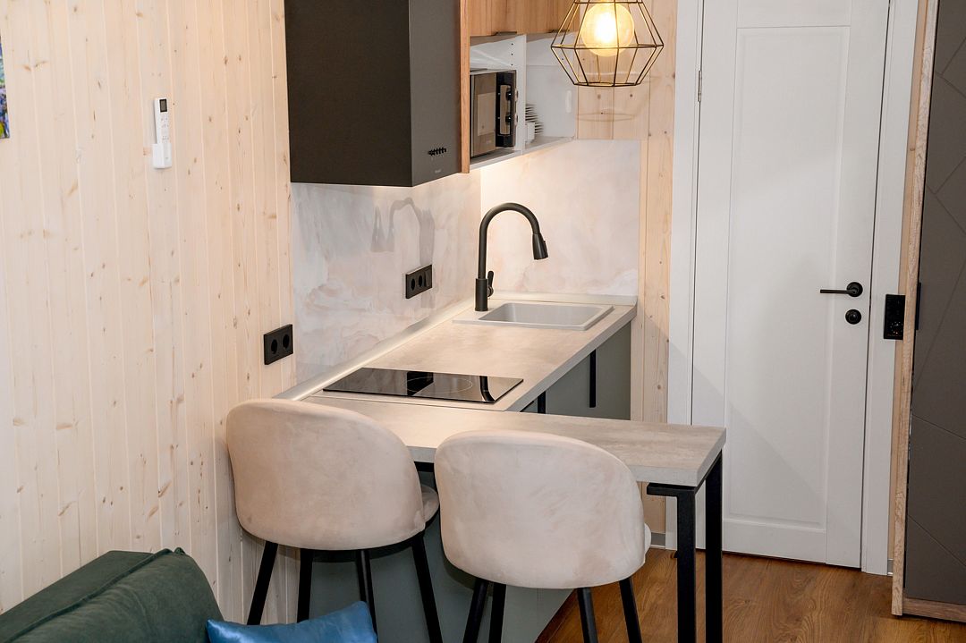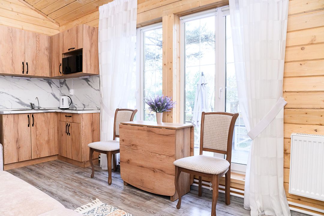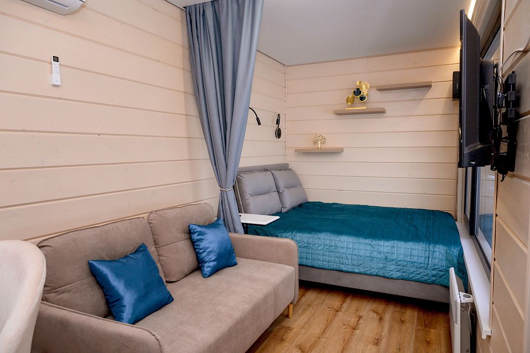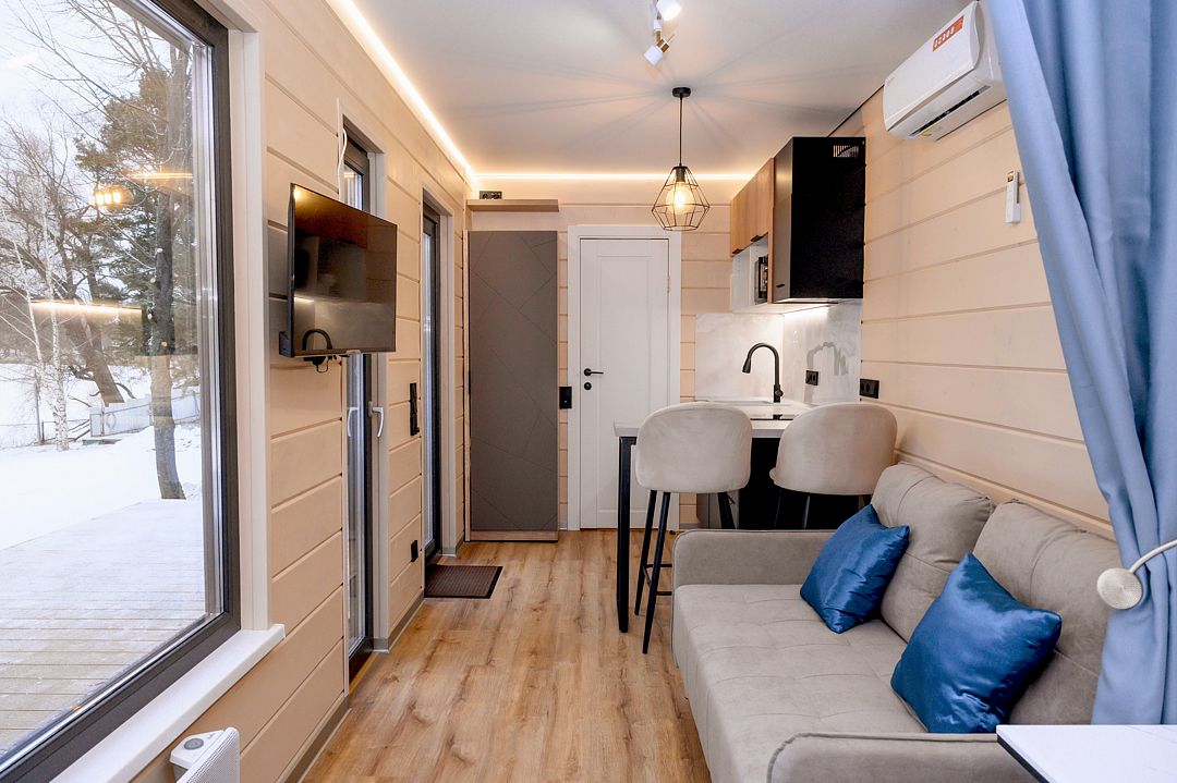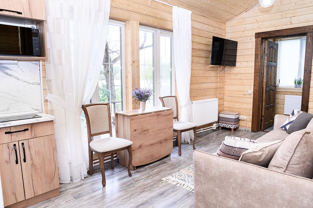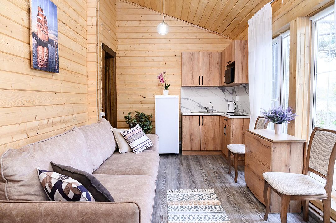Двухместный двухкомнатный дом с гостиной и кухонной зоной. Терраса.