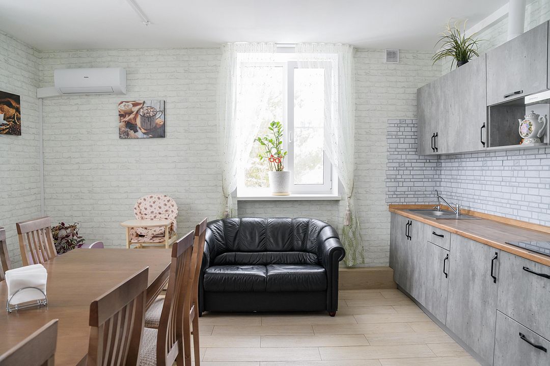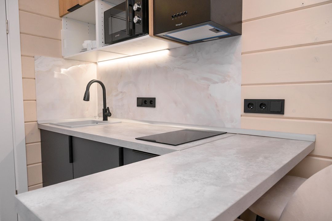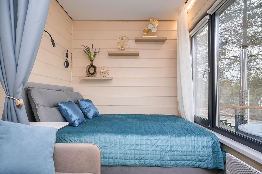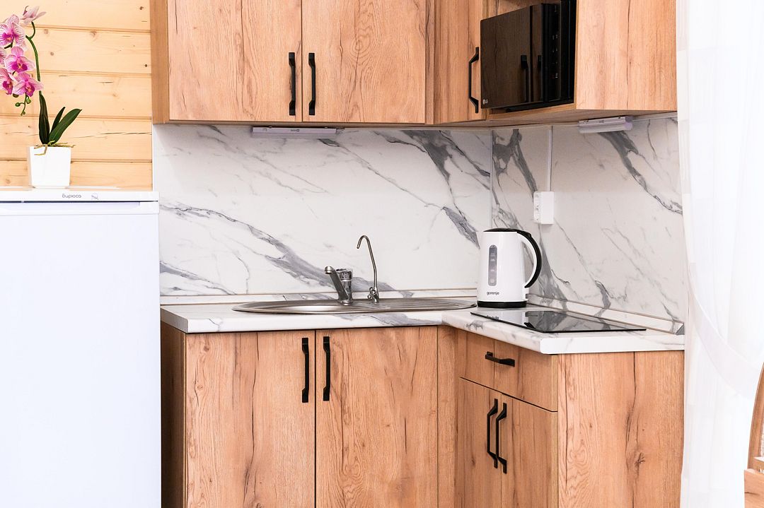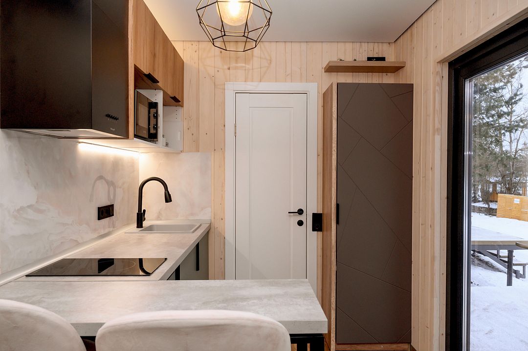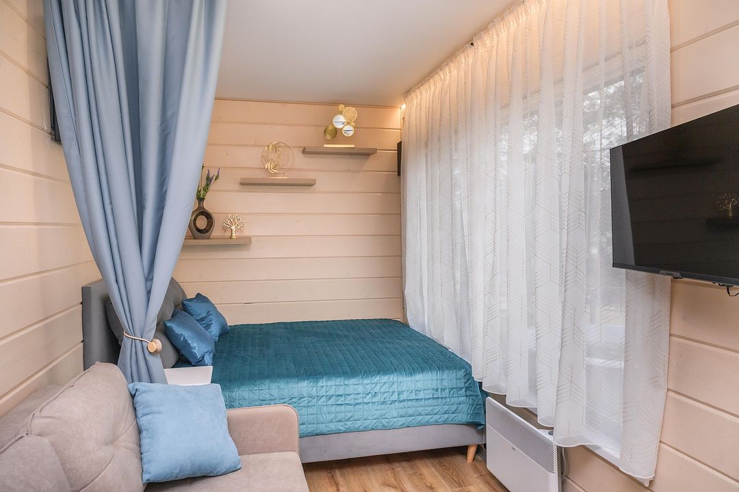 Двухместный двухкомнатный дом с гостиной и кухонной зоной. Терраса.