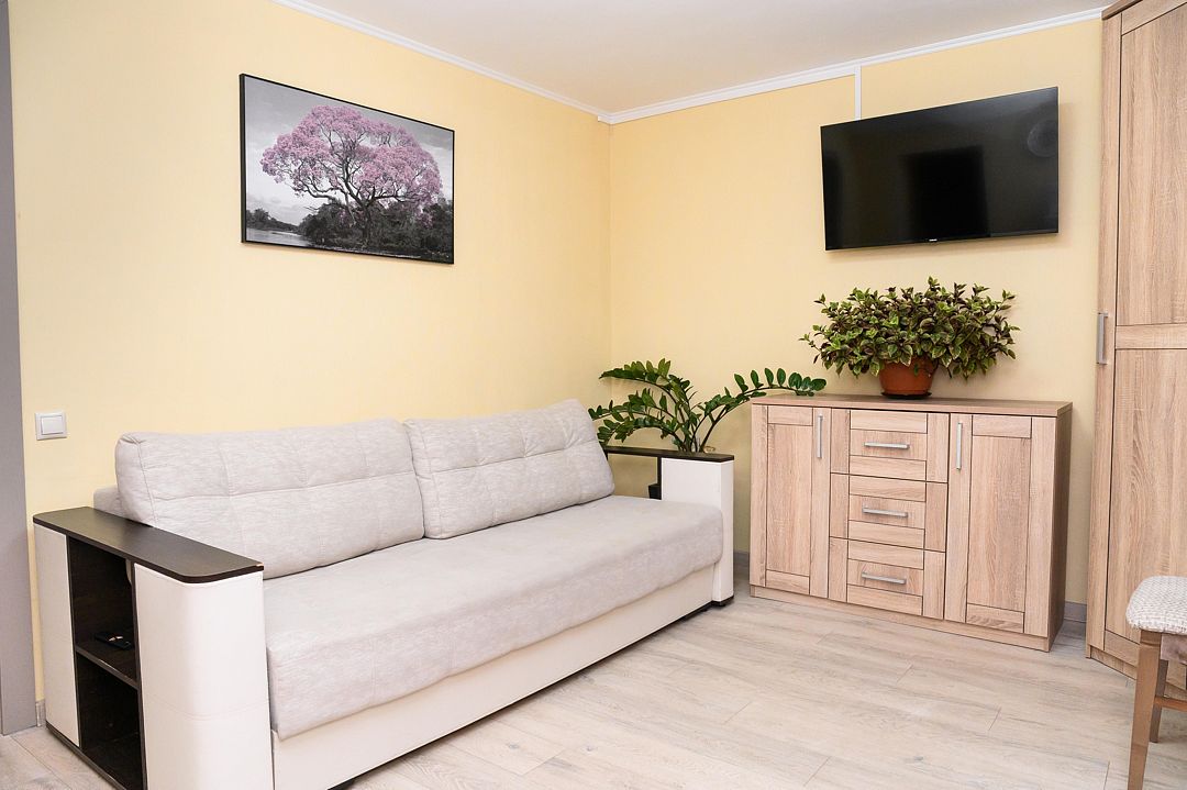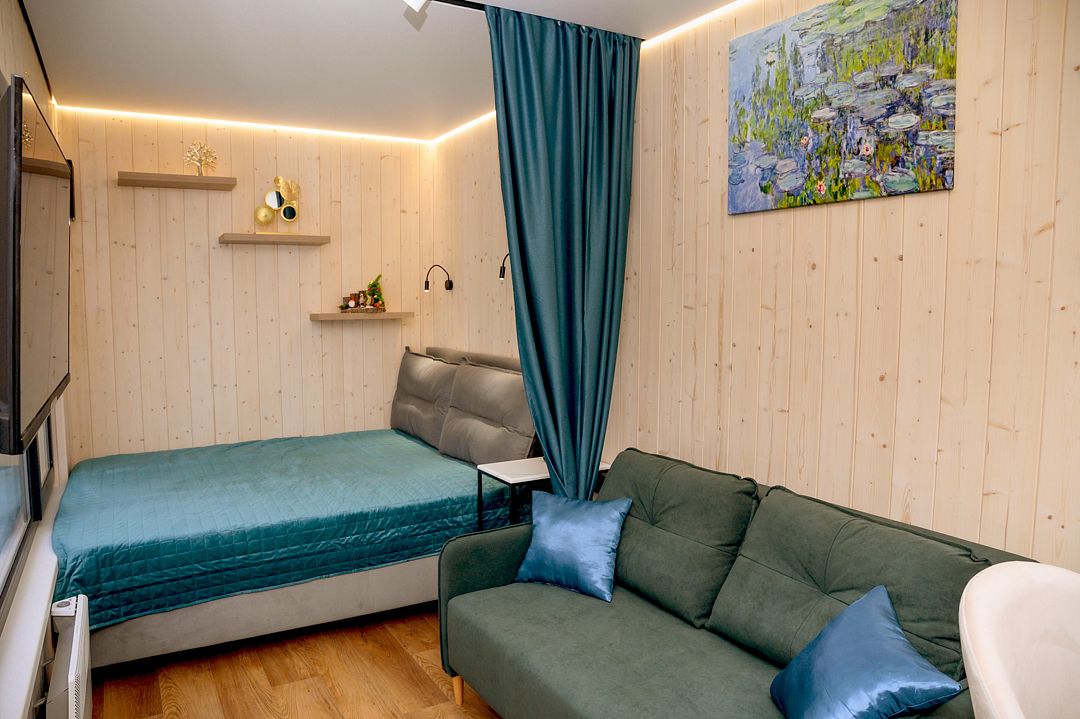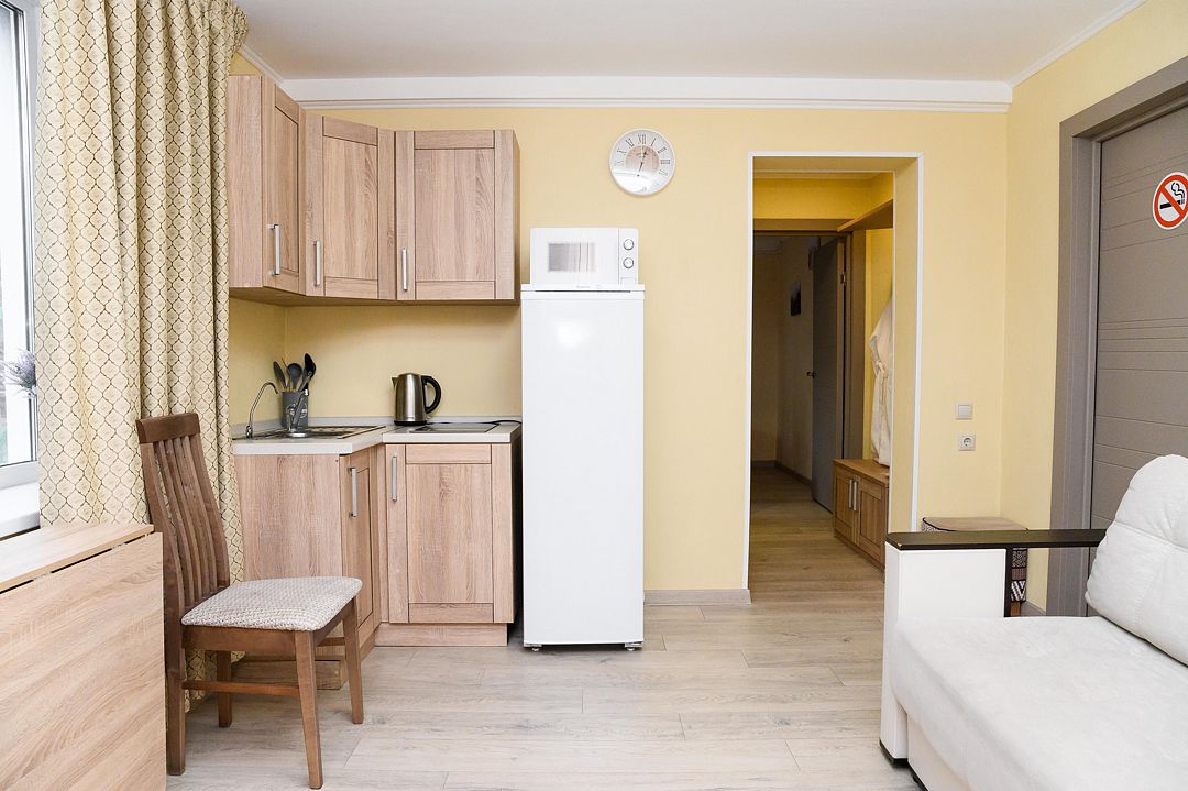 Двухместный двухкомнатный номер с гостиной и кухонной зоной.