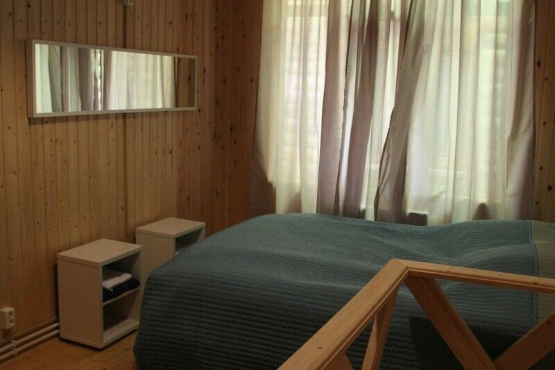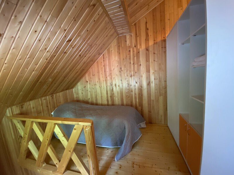 Двухуровневый домик, на первом этаже которого расположена зона отдыха, а также душ и туалет. На втором этаже спальня с одной двуспальной кроватью и двумя односпальными.