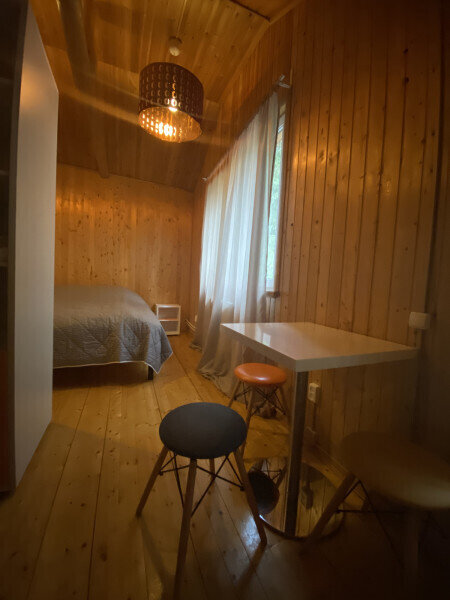 Двухуровневый домик. На первом этаже душ с туалетом, стол, стулья, на втором этаже расположена спальня с двуспальной кроватью.