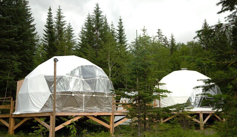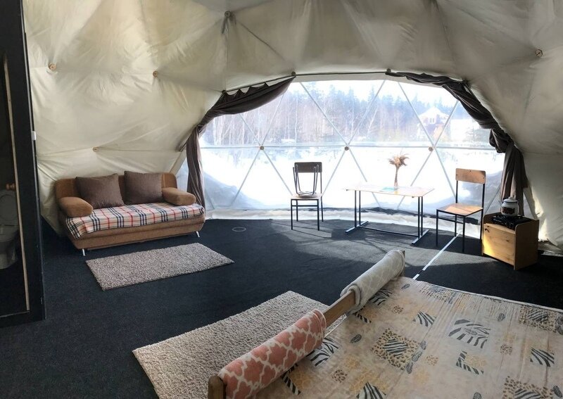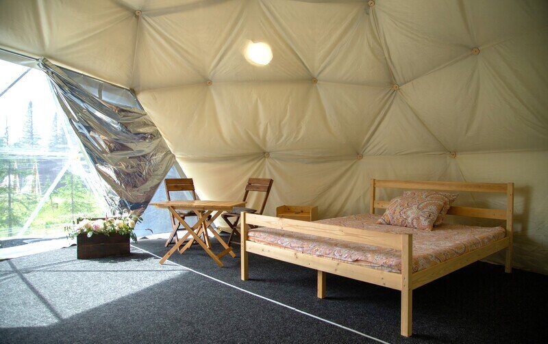 Для проживания предусмотрено 6 куполов, 2 шалаша и 3-этажный дом Гексагон. Купола – сферические строения по финской технологии, шалаши – двухэтажные деревянные здания с длинными скатными крышами. Гексагон – шестигранный деревянный дом с огромными окнами, самый комфортабельный вариант размещения, отдаленный от остальных корпусов.