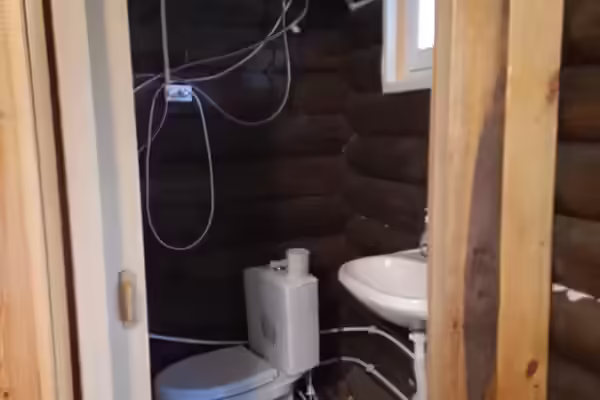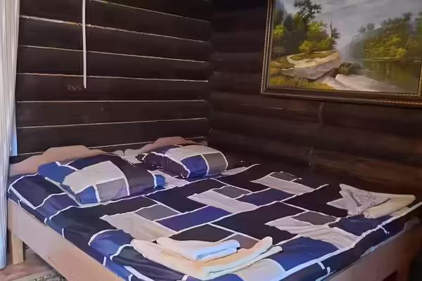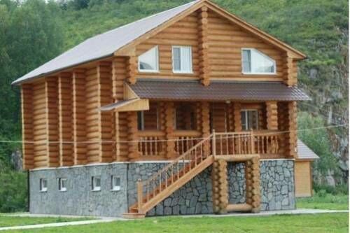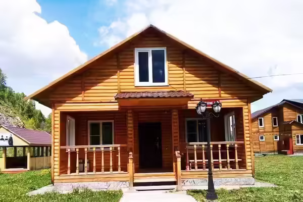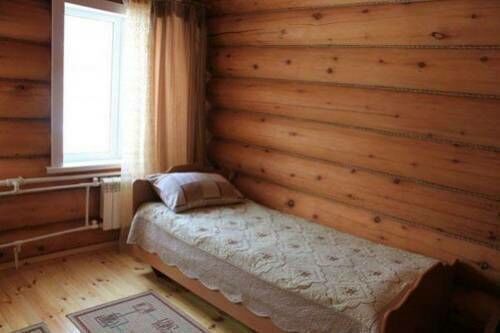Просторный коттедж из натурального кедра с полноценной кухней и бытовой техников. Есть общая зона отдыха с мягкой мебелью и кабельным ТВ.