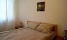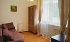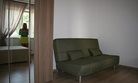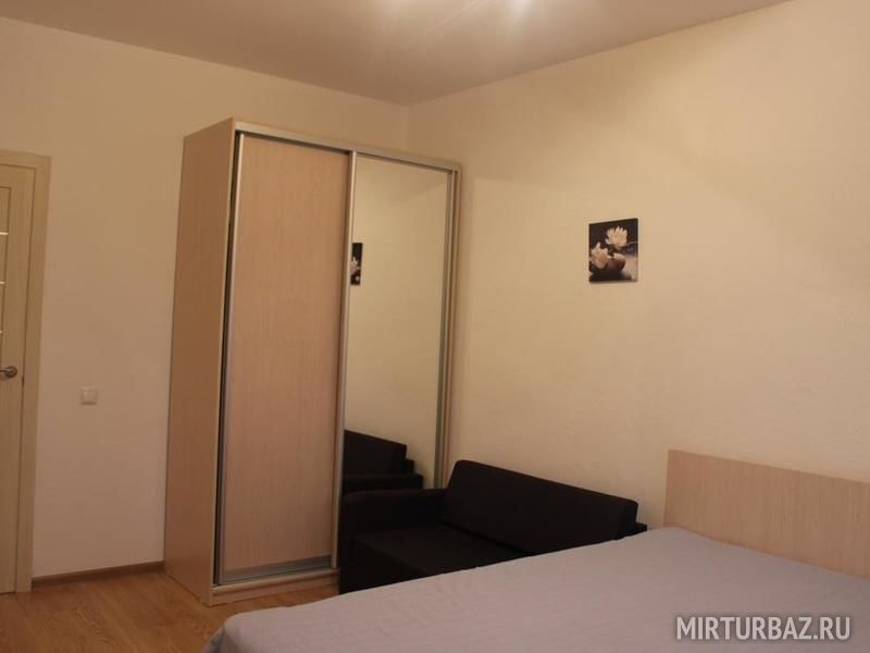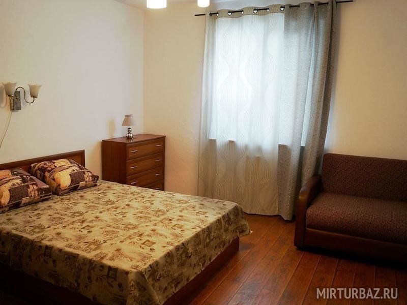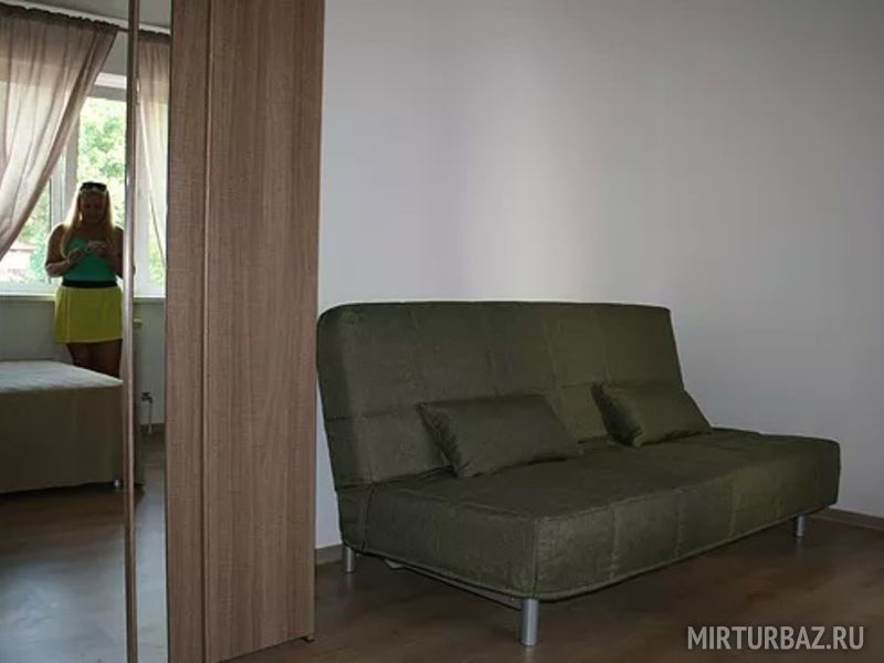 Одна большая комната разделена на две зоны: спальную с двуспальной кроватью и гостиной с диваном, раскладывающимся на 2 спальных места.