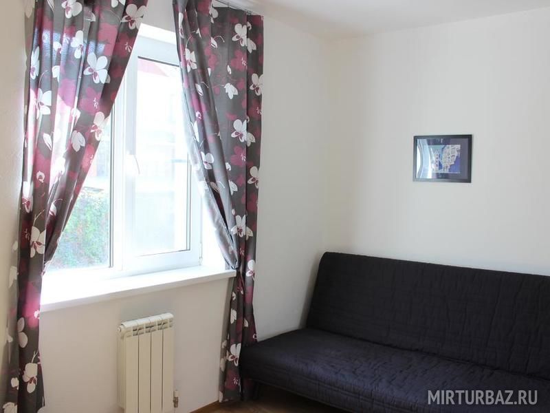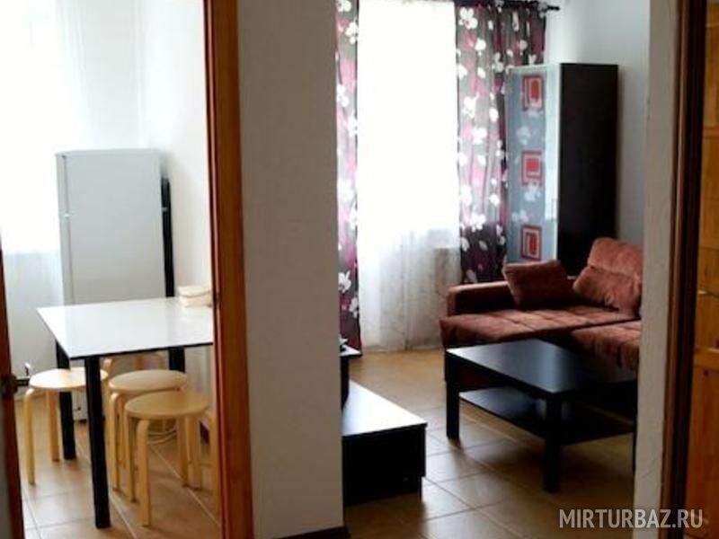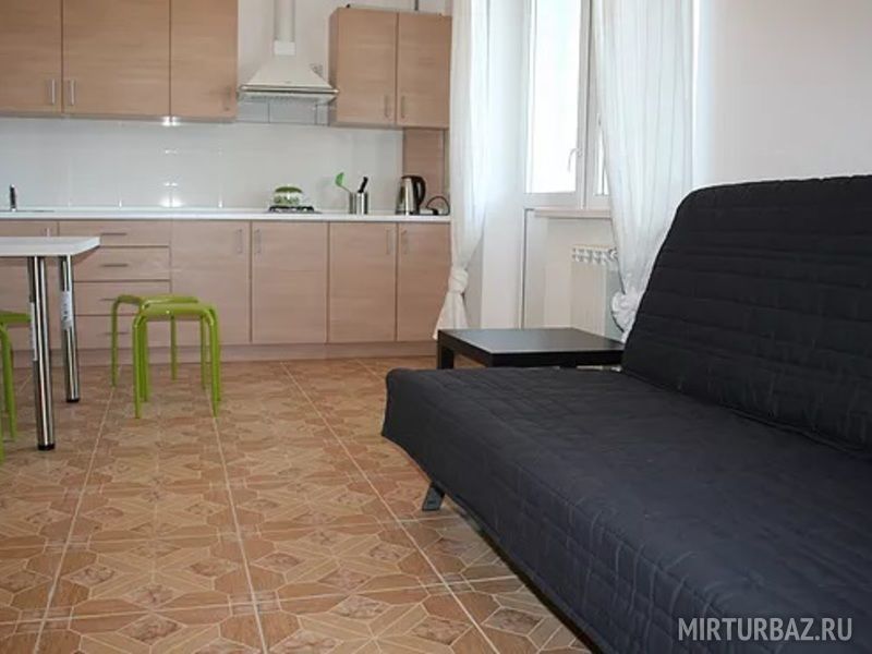 Апартаменты включают в себя спальную комнату с двуспальной кроватью и раскладным диваном на двоих, просторную кухню-гостиную с барной стойкой, холодильником и двумя диванами, на которых может разместиться на ночь двое взрослых.