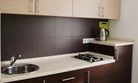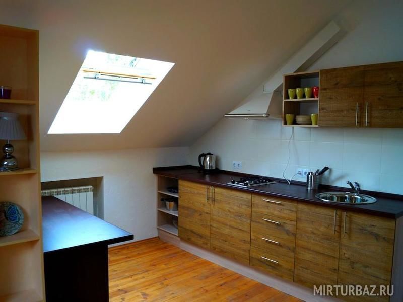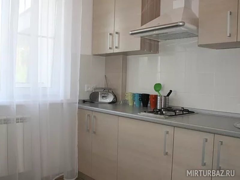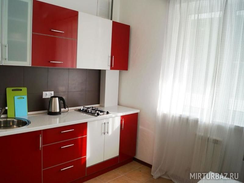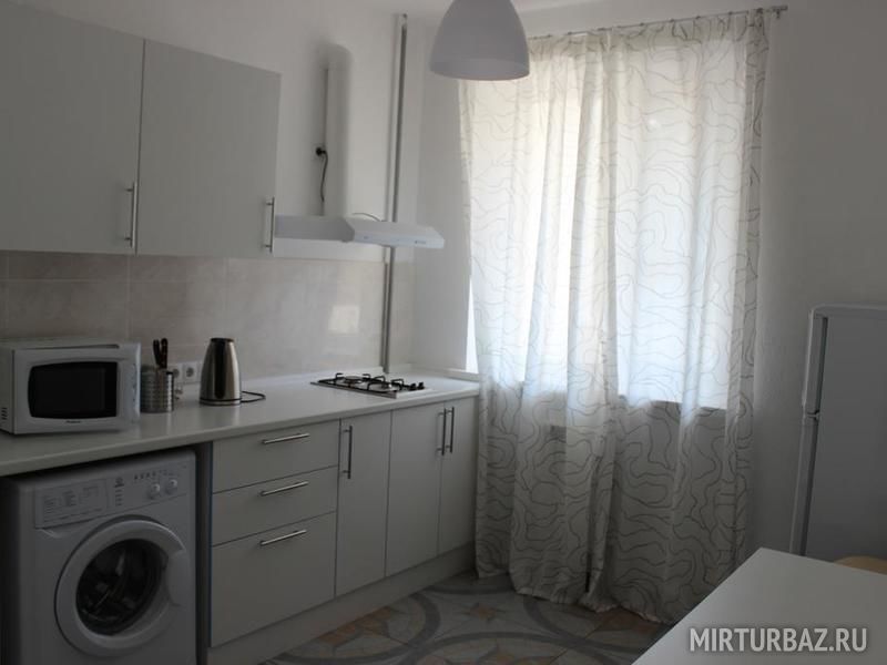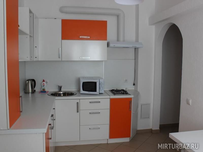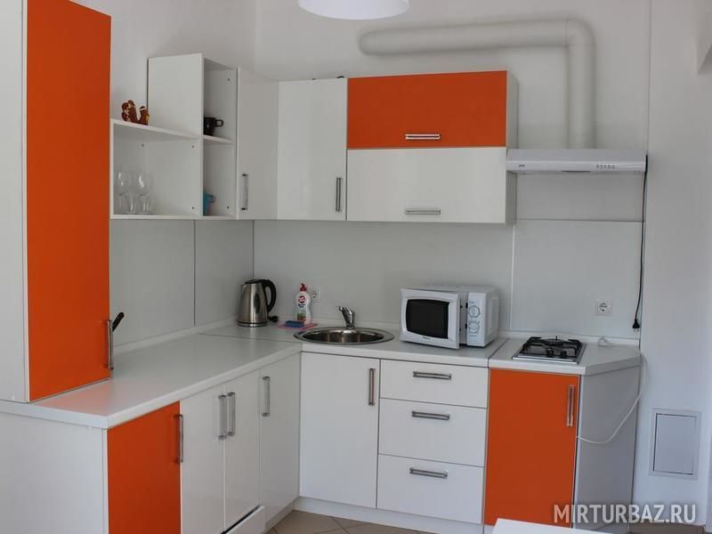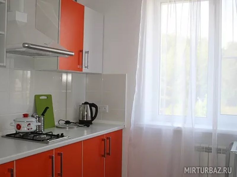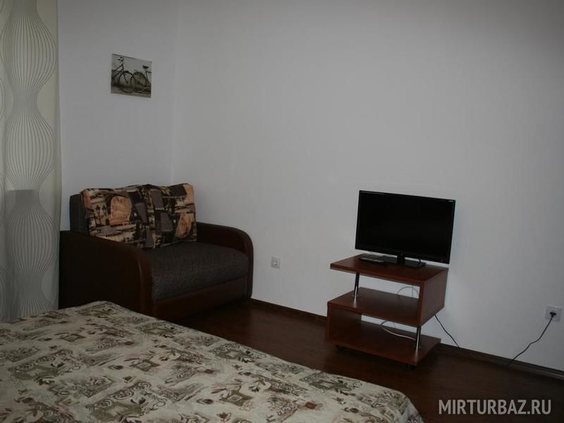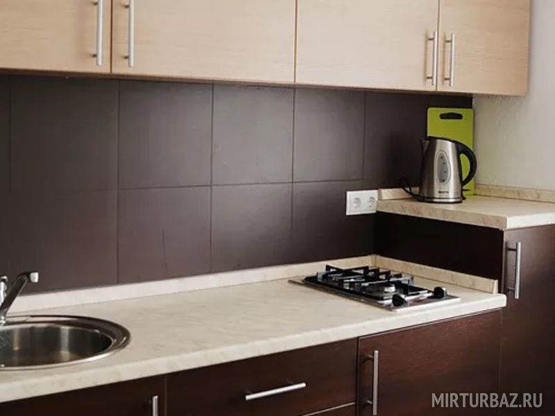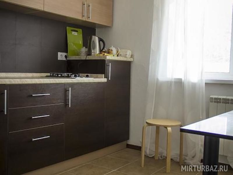 В оборудование апартамента входит кухня с холодильником, микроволновкой, электрочайником и газовой плитой, комплект посуды и, само собой, телевизор.