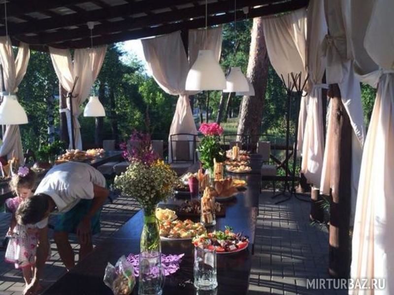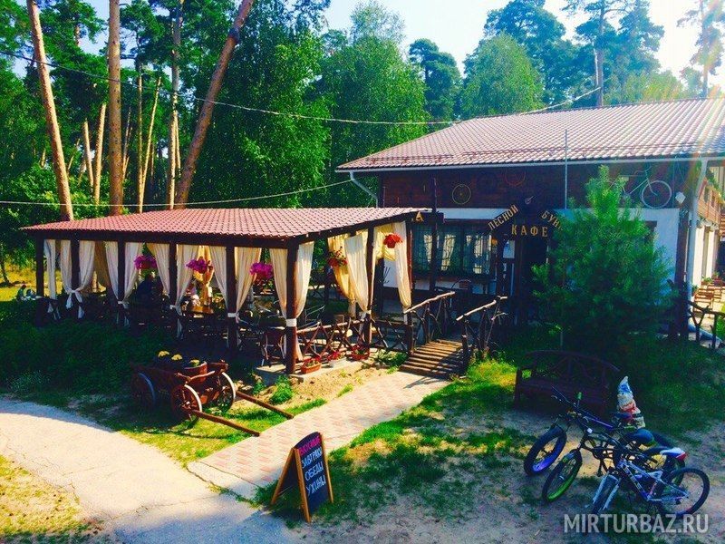 На территории базы отдыха работает кафе-бар, где можно заказать блюда по меню. Для гостей, проживающих в номерах отеля, подаются завтраки.