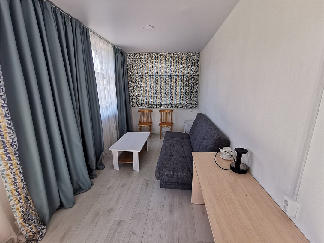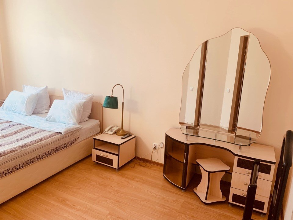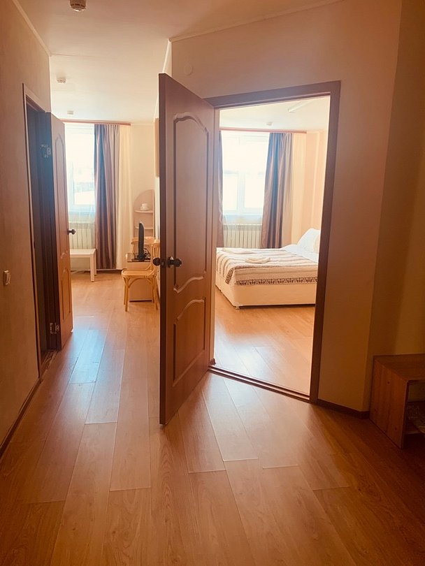 Представляем вам просторный двухкомнатный номер первой категории, где продуманный дизайн и современный комфорт создают идеальную атмосферу для отдыха. Пространство номера гармонично разделено на две зоны: -Спальня, оформленная со вкусом и элегантностью: уютная двуспальная кровать, зеркальный шкаф и изящный туалетный столик. -Гостиная, оборудованная для отдыха и работы: мягкий диван, функциональный рабочий стол, спутниковое телевидение и телефон. К вашим услугам: - Wi‑Fi; -полный санузел с ванной; -фен, банные халаты, тапочки и набор туалетных аксессуаров. Номер идеально подходит как для двоих гостей, так и для размещения третьего человека — на комфортабельном диване в гостиной.Услуги и удобства