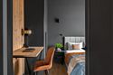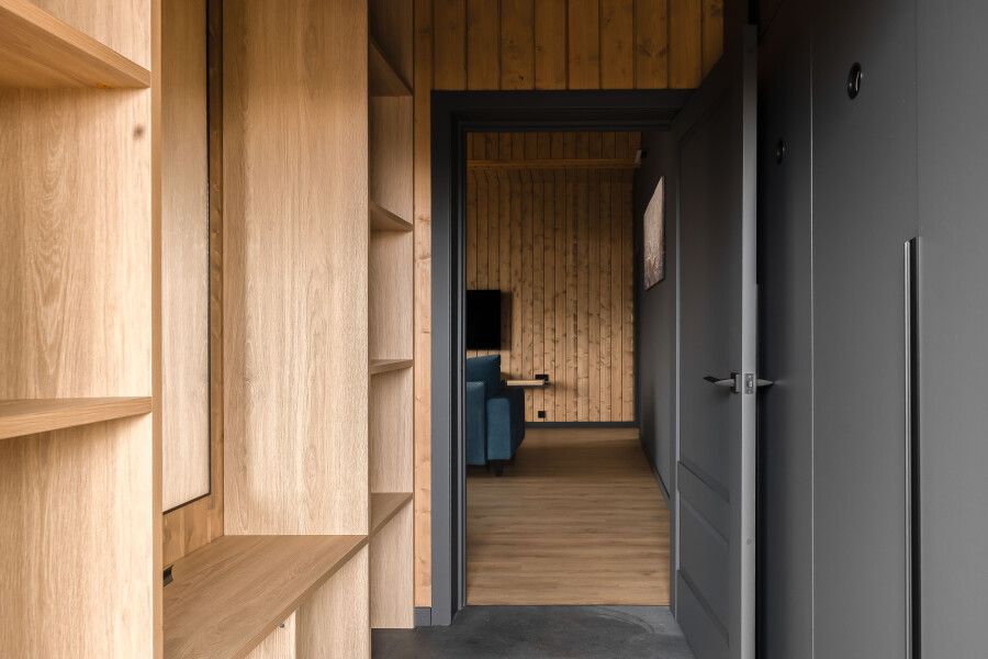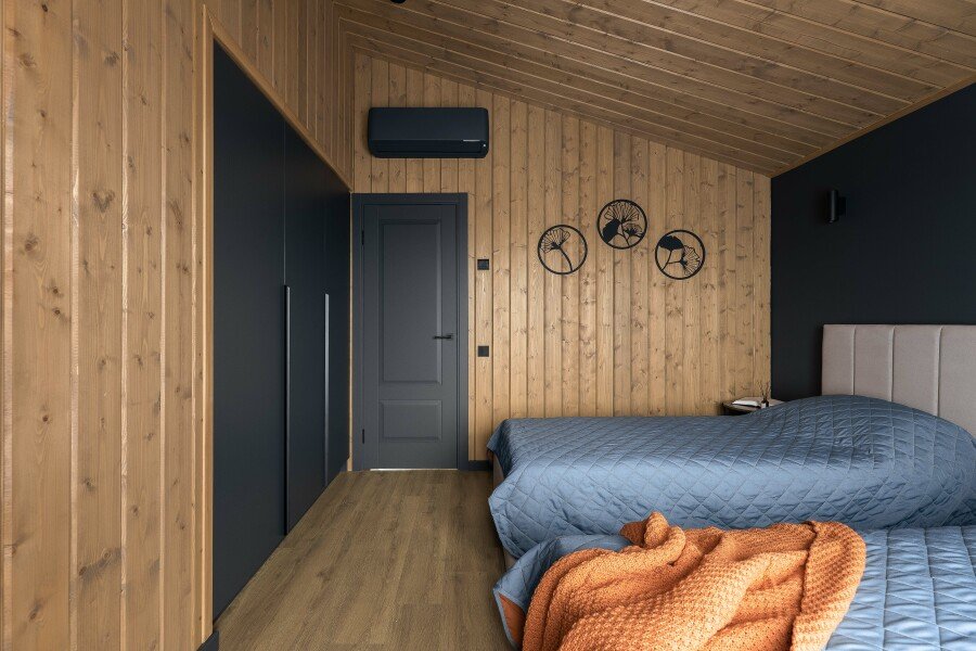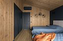 Дом состоит из двух комнат, кухни-гостиной и двух санузлов — мастер-спальни с двуспальной кроватью 160х200, спальни с кроватью трансформером, где предлагаются два варианта размещения: две односпальные кровати 80х200, либо сдвоенная кровать через дополнительный матрас топпер 160х200, кухни-гостиной с диваном-кроватью 140х200, два санузла с душевой кабиной и теплым полом.