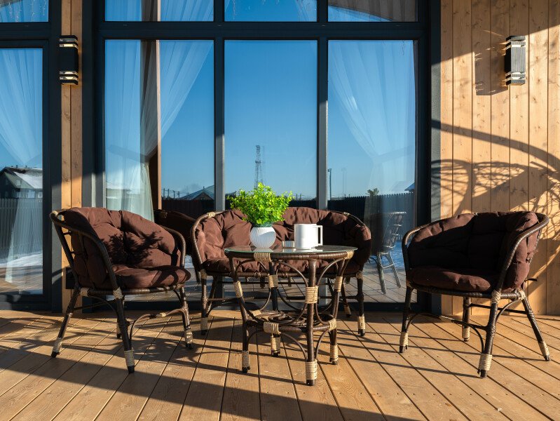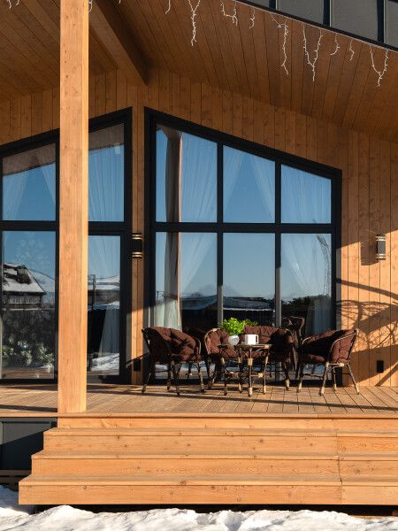 На веранде дома гостей встречает подогреваемая купель с эффектом джакузи. Вечерняя подсветка и вода комфортной температуры около 38 градусов создают идеальные условия для отдыха и наслаждения парением на свежем воздухе.