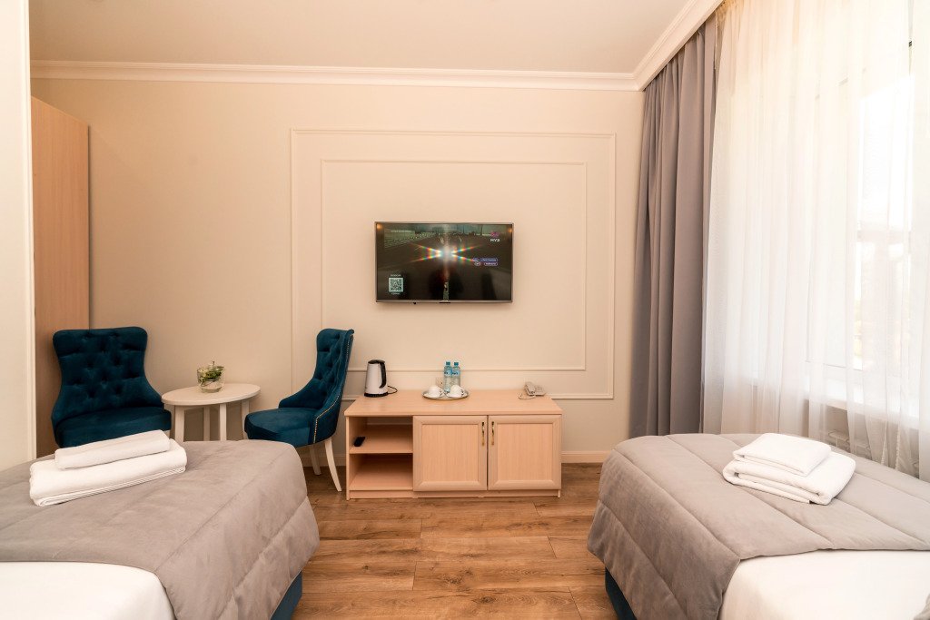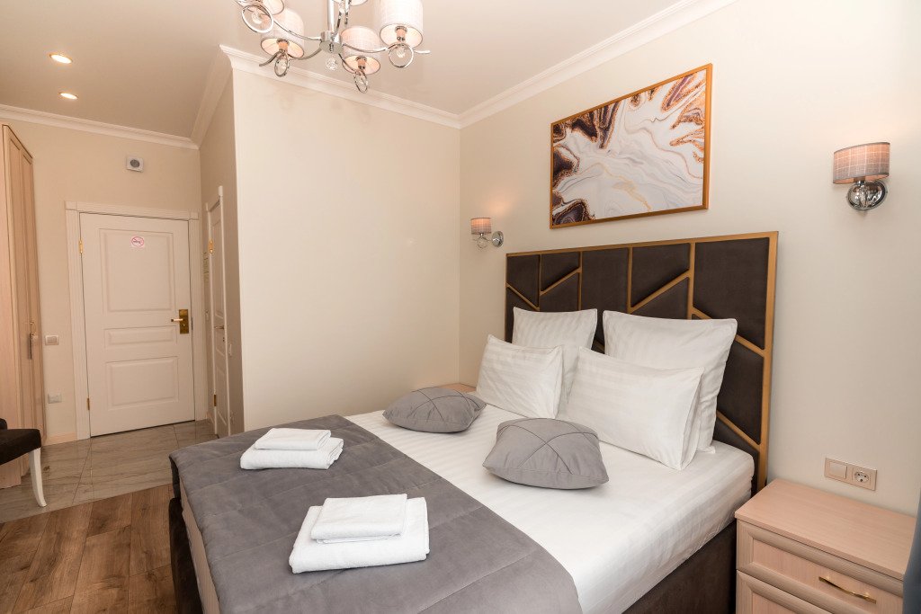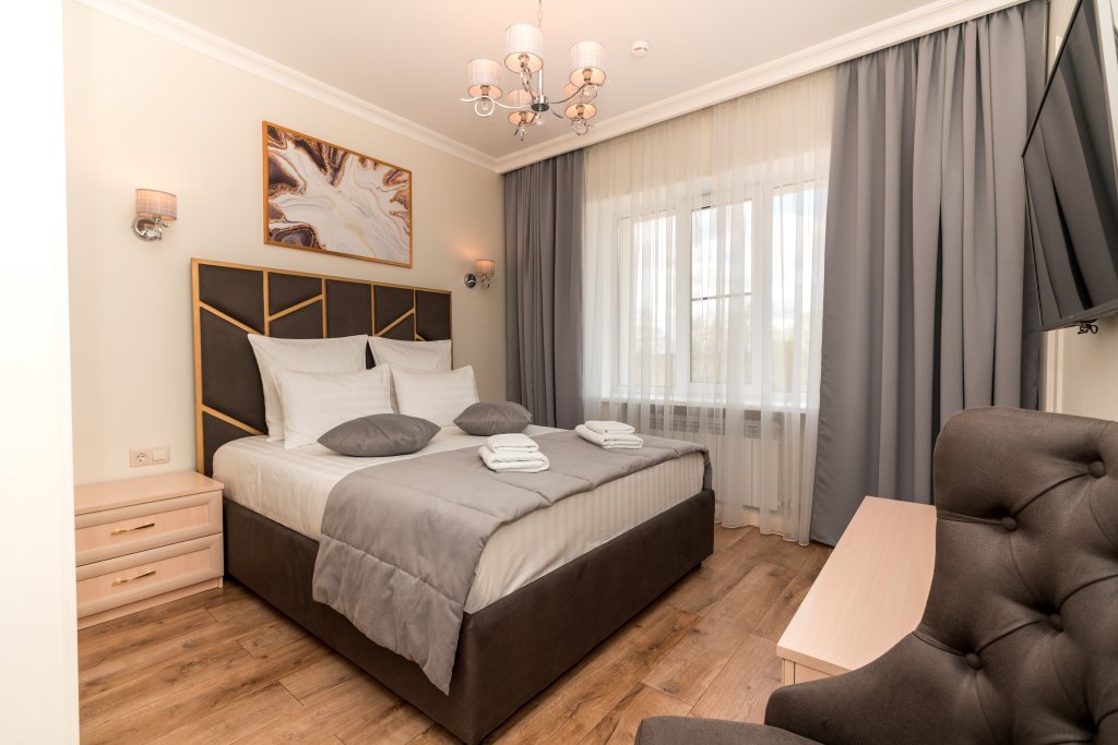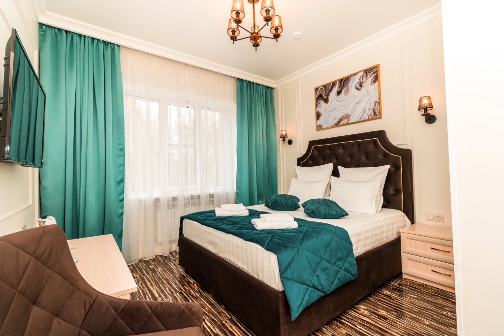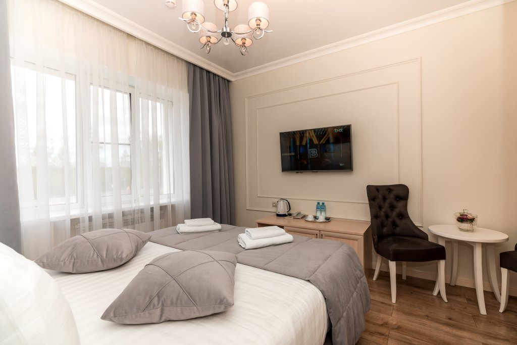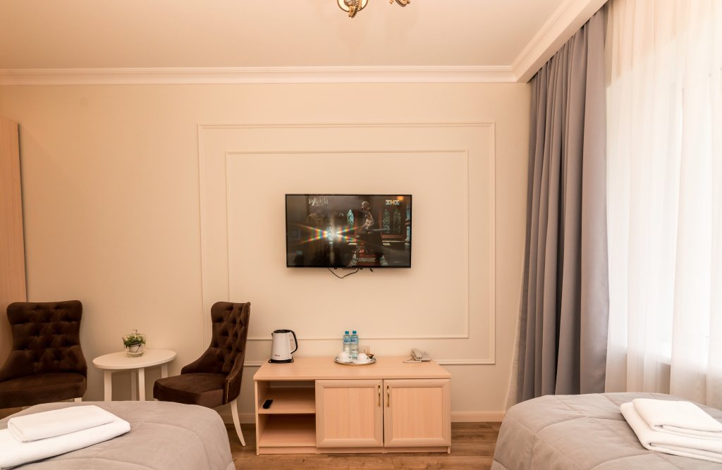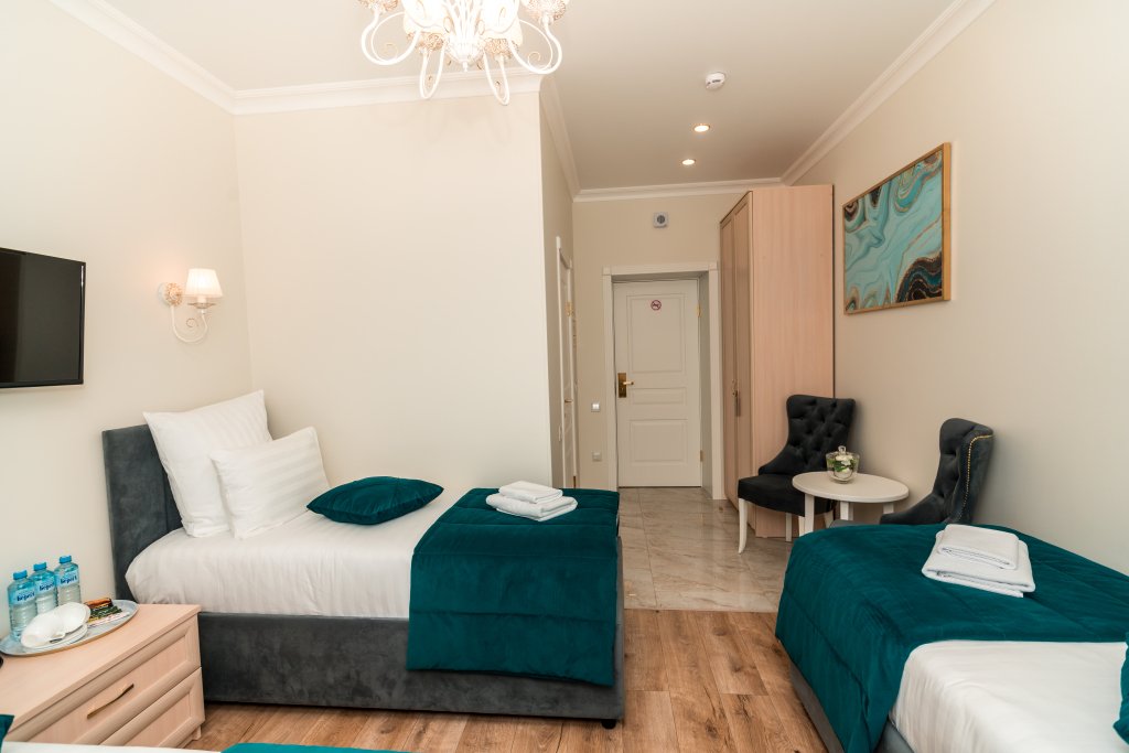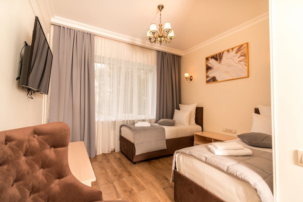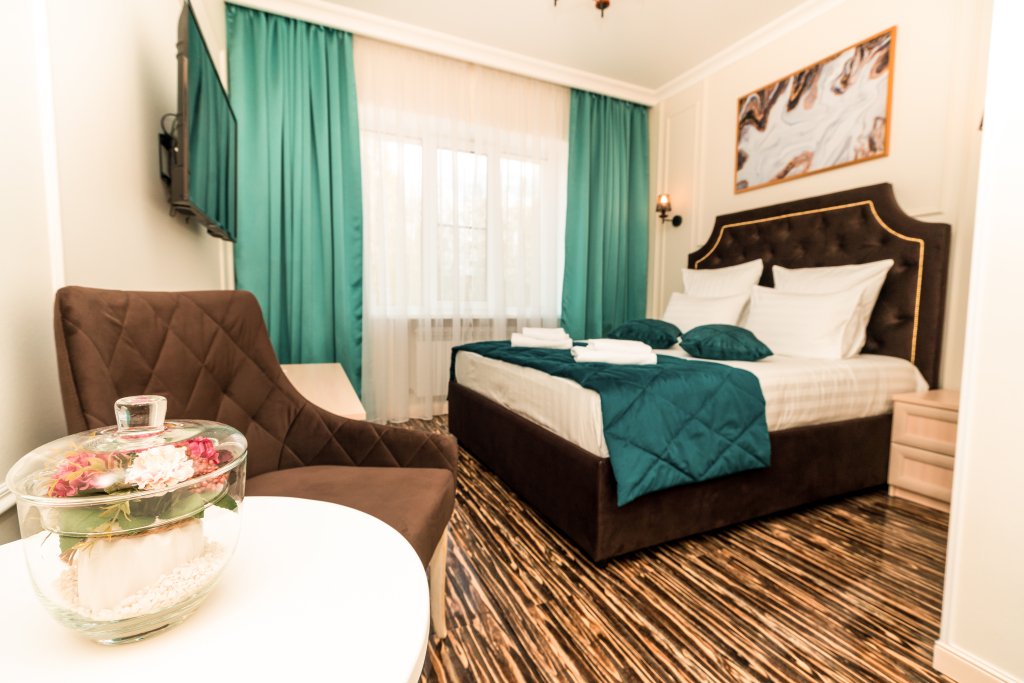 В отеле тридцать один номер. В каждом номере для проживания есть: телефон, TV, Wi-Fi, чай, кофе, фен, питьевая бутилированная вода, халат и тапочки, индивидуальный набор косметики для душа, два кресла и столик.