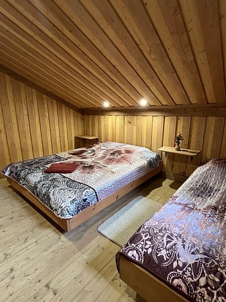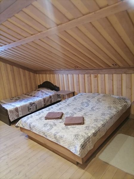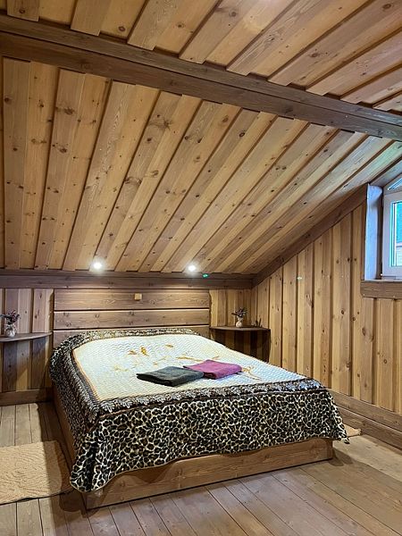 В доме 2 спальни с двуспальными кроватями, дополнительные спальные места на двуспальном диване (часть комнаты зонирована) . По запросу предоставляется детская кроватка.