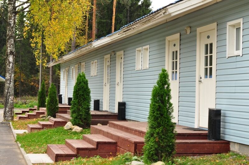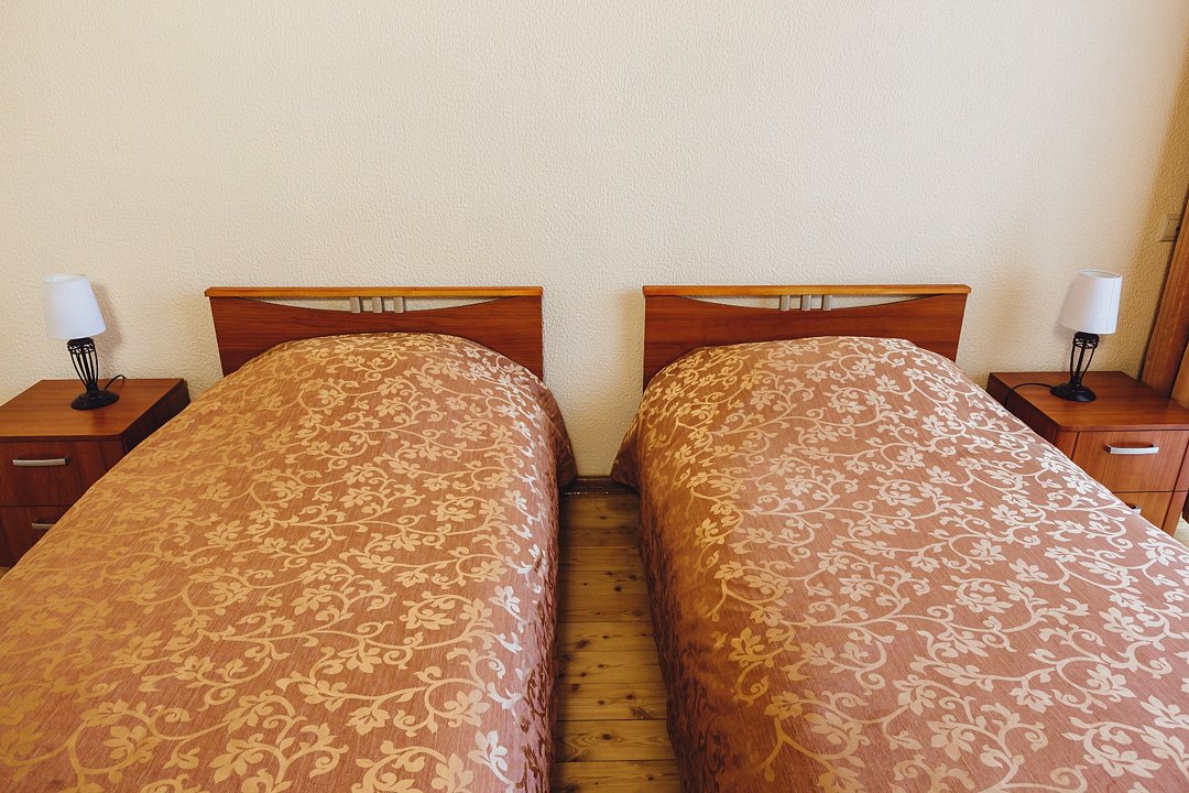 В одноэтажном здании пять однокомнатных двухместных номеров и два однокомнатных трёхместных номера. В каждый номер отдельный вход.