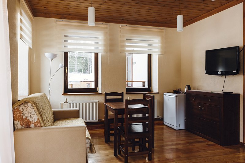 Отель состоит из четырех отдельно стоящих деревянных корпусов в один и два этажа и домика из бруса. Номерной фонд рассчитан на размещение 100 человек. Все номера укомплектованы мебелью из натурального дерева, необходимой бытовой техникой, оснащены ванной комнатой с полами с подогревом. В коттеджах, размещенных во 2 и 4 корпусах, имеется оборудованная кухня.