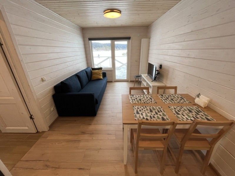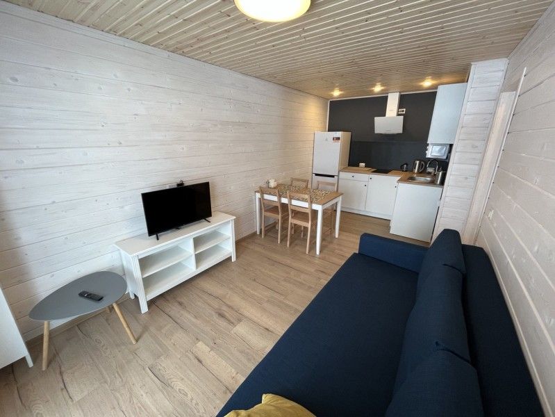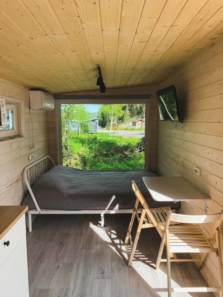 Дом способен принять 4 взрослых, также есть детская кроватка. Дом внутри: гостиная-кухня (раскладной двуспальный диван), отдельная спальня с двуспальной кроватью, санузел, прихожая и терраса.