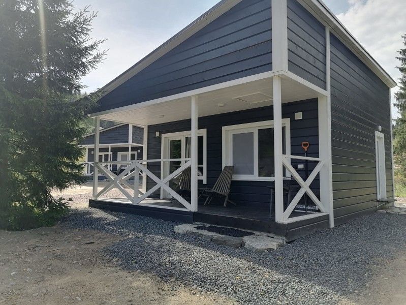 В домике объединённое пространство гостиной и кухни (раскладной двуспальный диван), отдельная спальня с двуспальной кроватью, санузел с душевой и большая веранда с видом на Ладожское озеро.