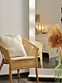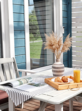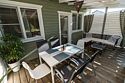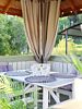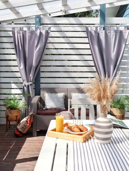 Уютная терраса или беседка с уличной мебелью, текстилем и атмосферными лампочками.
