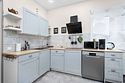 Электрическая плита, посудомоечная машина, холодильник, микроволновая печь, кофеварка, чайник, посуда и столовые приборы.