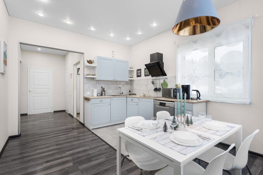 Оформлен в скандинавском стиле и рассчитан на проживание 6 человек (дополнительно может быть предоставлена детская кроватка).