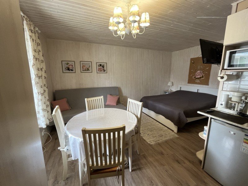 Семейный номер студия 25 кв. м с отдельным входом с улицы и своей террасой. В каждом номере своя кухня, обеденный стол, шкаф, санузел, двуспальная кровать и раскладная диван-кровать. Возможно размещение 1-4 гостя.