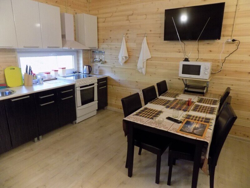 Дом состоит из 2 спален, хорошо оборудованной кухни с обеденной зоной, smart-телевизором, электроплитой, чайником, микроволновой печью, посудомоечной и стиральной машиной.