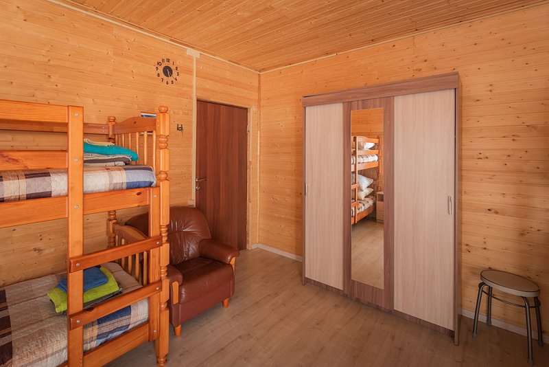 В каждой спальне 1 односпальная и 1 двухъярусная кровать, шкаф для одежды, столик, выход на террасу.