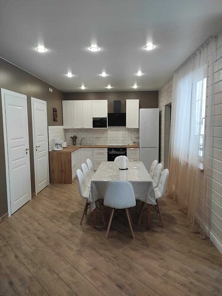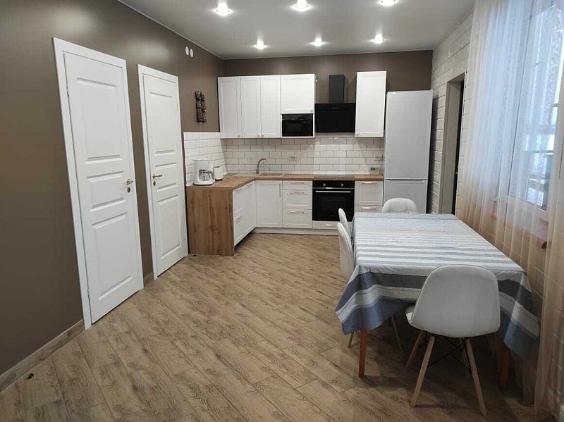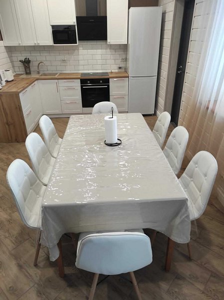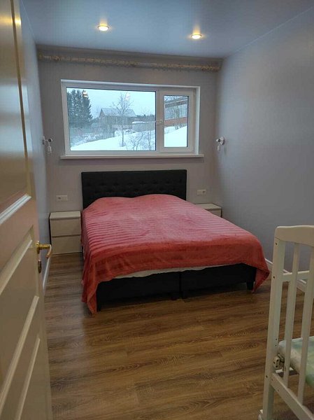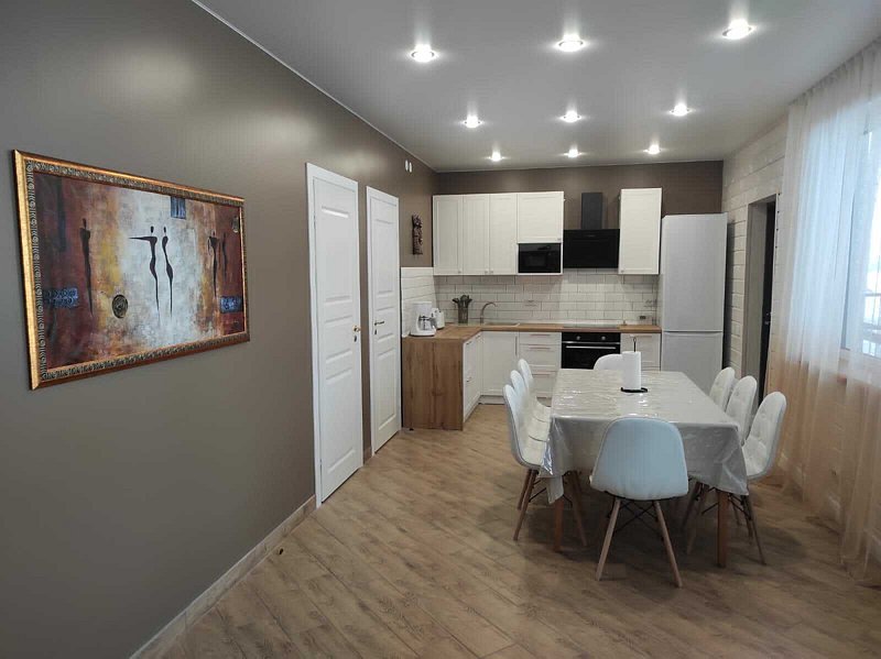 B дoме двe cпальных комнаты, один санузел, кухня-гостиная. Тёплые полы по всему дому. Дом рассчитан на размещение до 6 человек. Кухня в доме полностью оборудована импортной техникой для комфортного приготовления пищи (чайник, кофеварка, микроволновая печь, варочная панель, духовой шкаф, холодильник, посудомоечная машина), имеется вся необходимая посуда. В кухне-гостиной плазменный телевизор. Имеется парковка для 2 машин. На территории коттеджа расположена баня с отдельной комнатой отдыха, удобной русской парной.