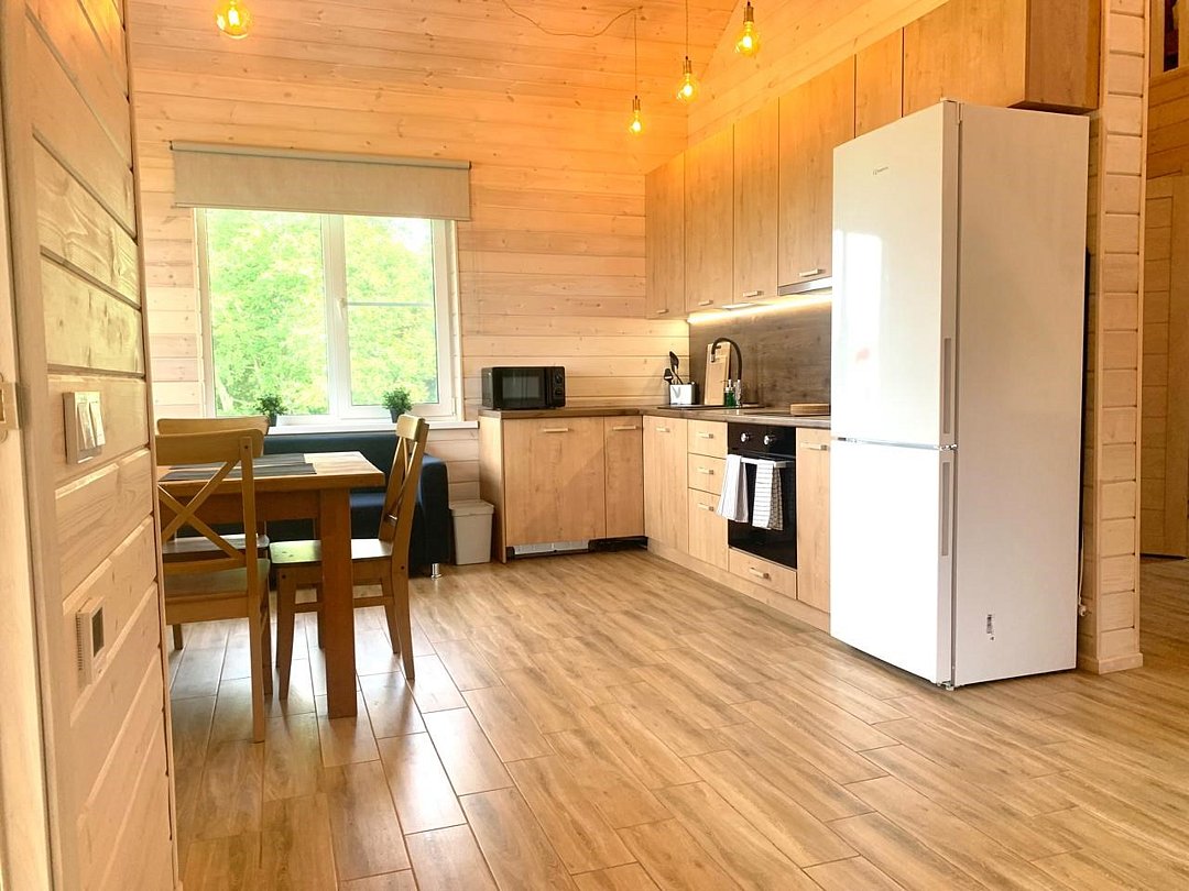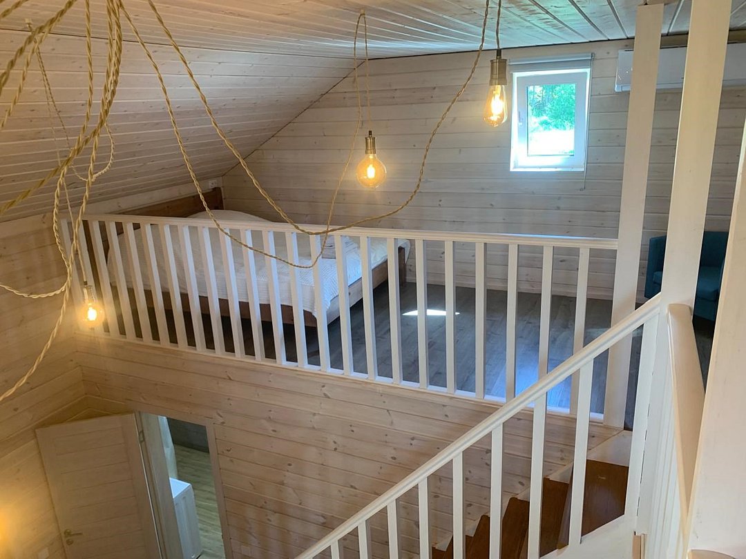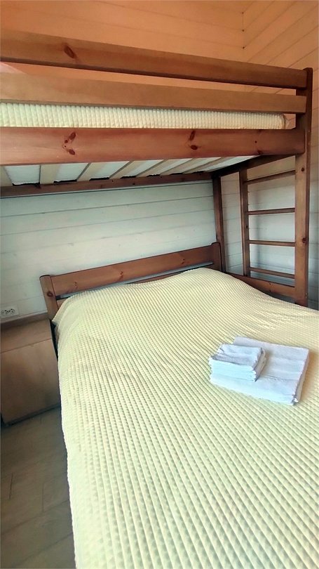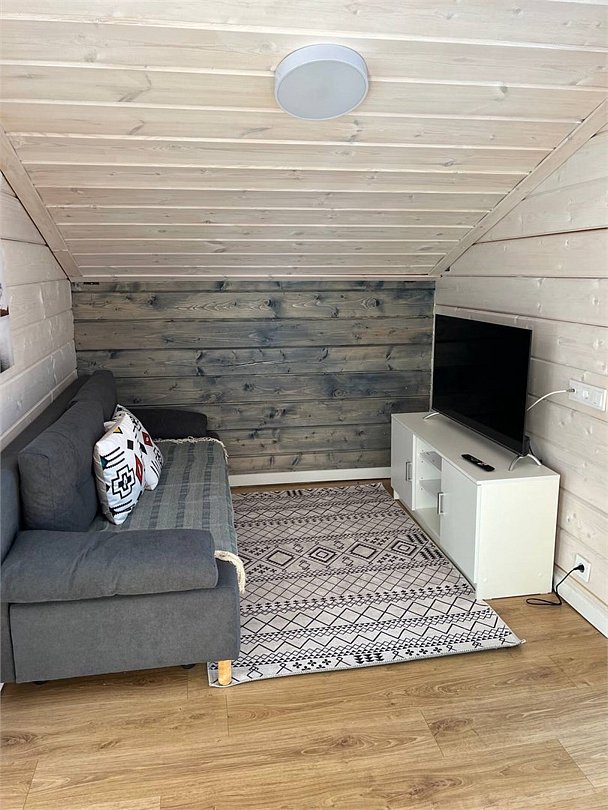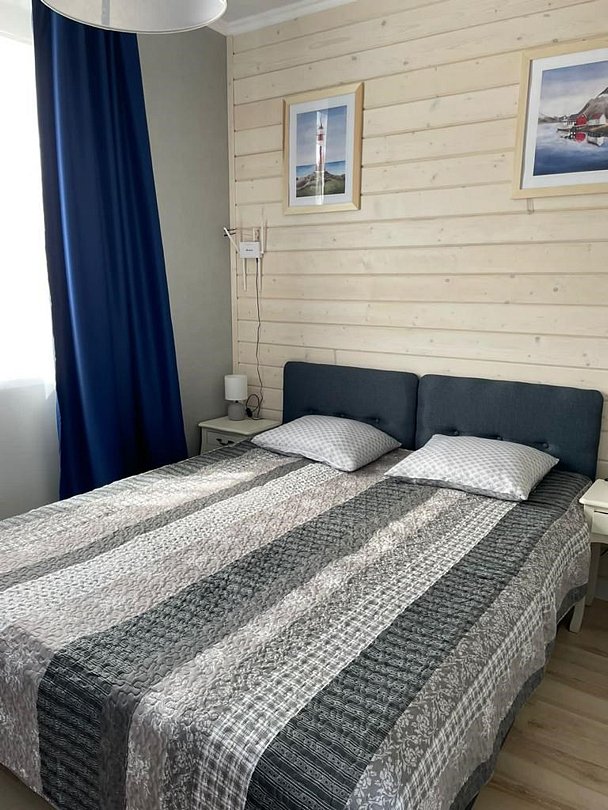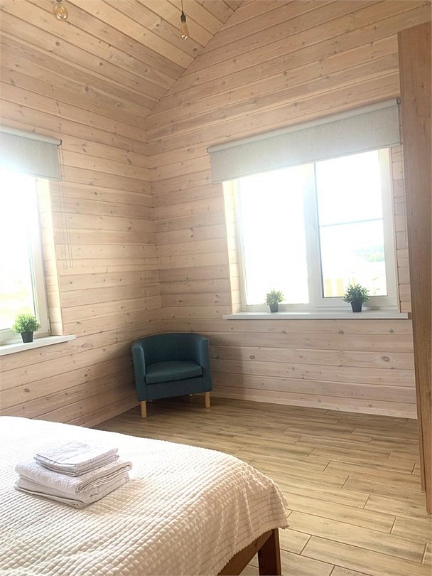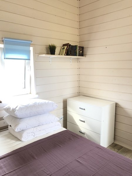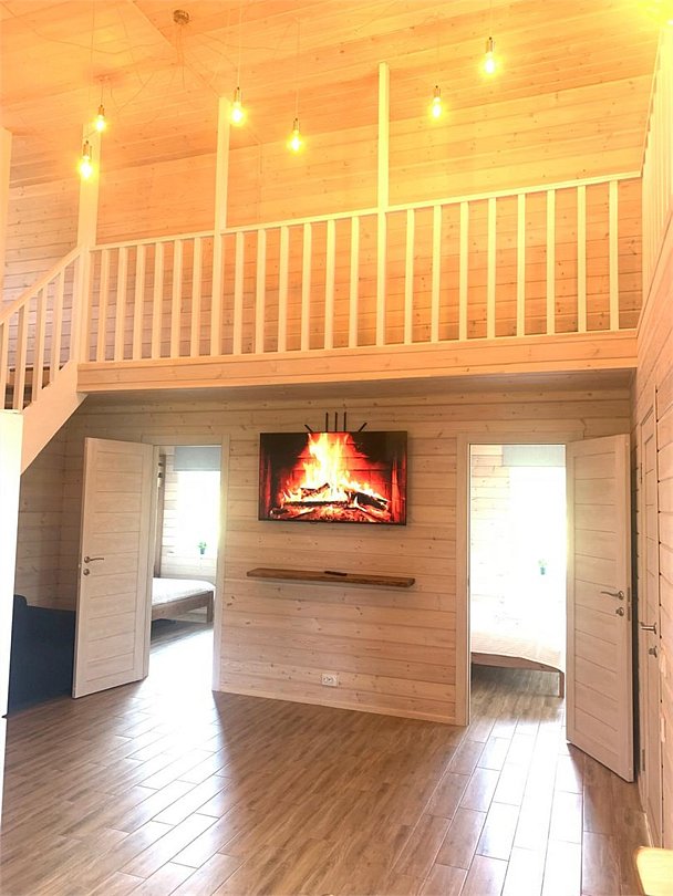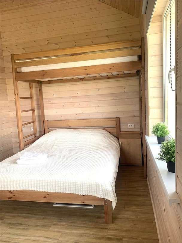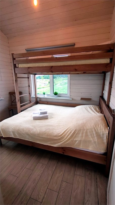 Рассчитан на 8 (3+3+2) человек для семейного отдыха, Две отдельных спальни и лофт (спальное двуспальное место на антресоли), полностью оборудованная кухня, гостиная, сауна, туалет, душ, телевизор, холодильник, микроволновая печь, посудомоечная машина, стиральная машина, утюг. Есть вся посуда!