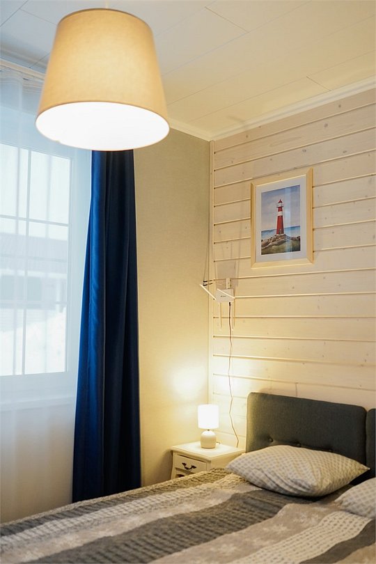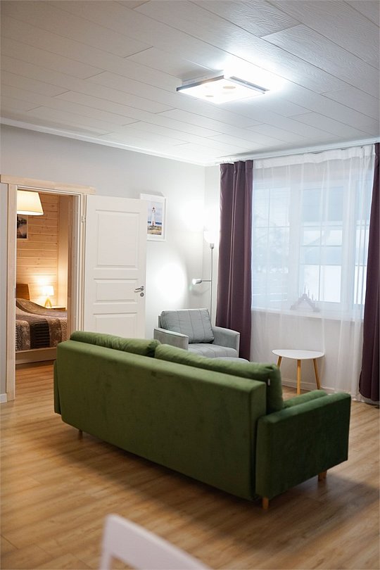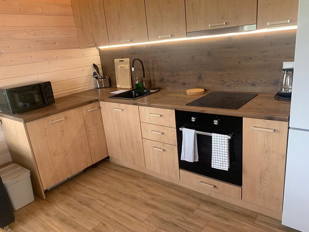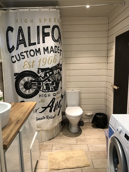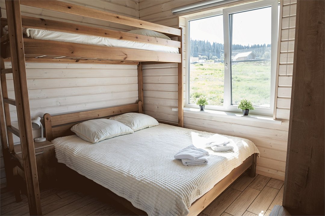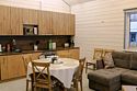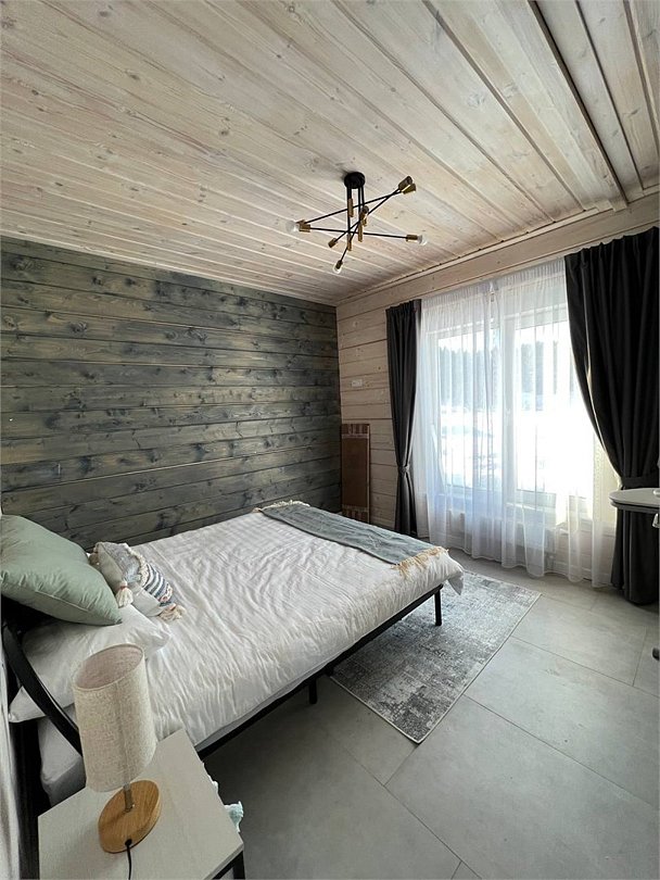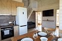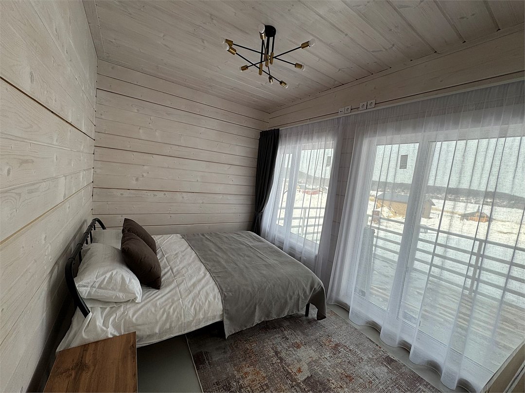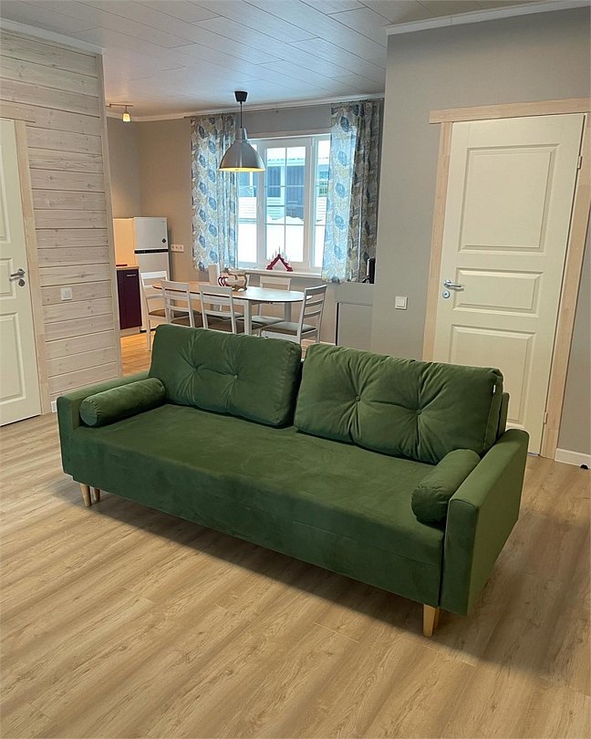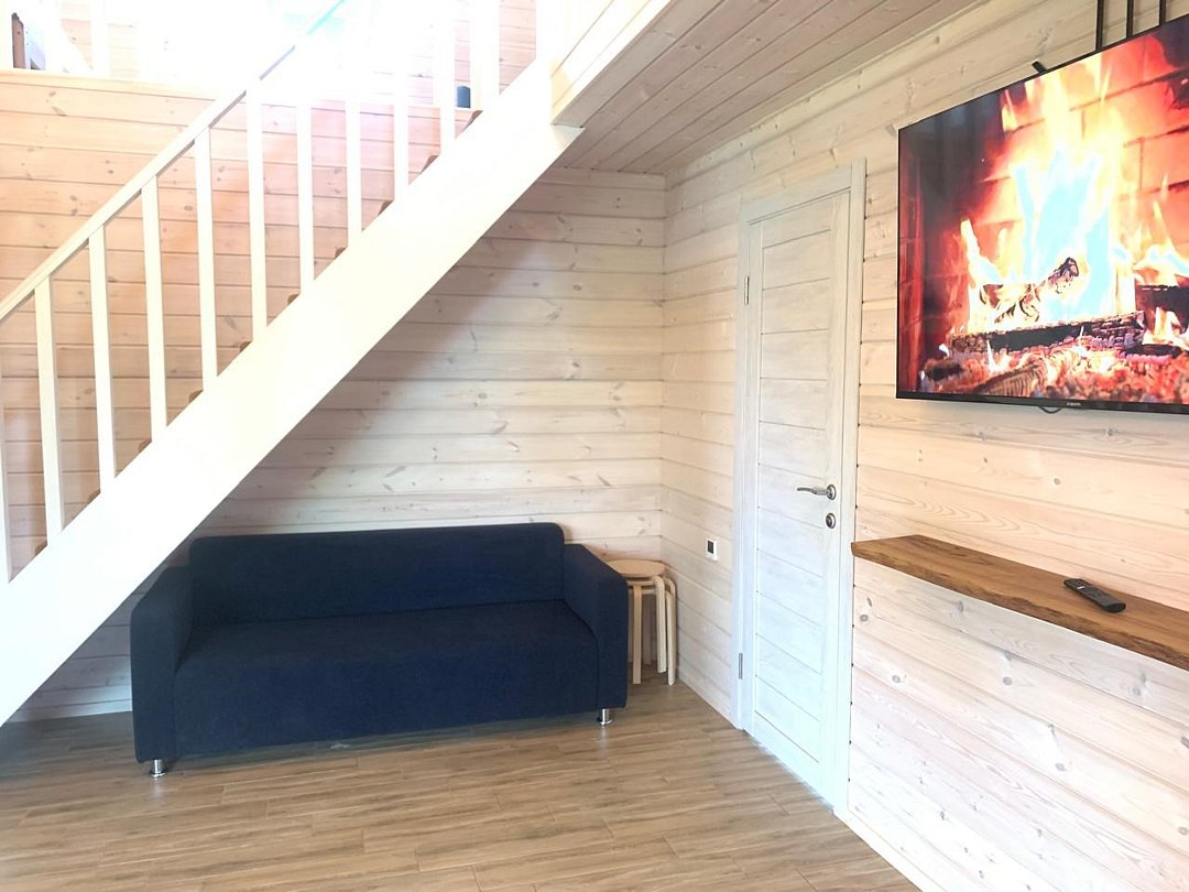 Рассчитан на 8 (3+3+2) человек для семейного отдыха, Две отдельных спальни и лофт (спальное двуспальное место на антресоли), полностью оборудованная кухня, гостиная, сауна, туалет, душ, телевизор, холодильник, микроволновая печь, посудомоечная машина, стиральная машина, утюг. Есть вся посуда!