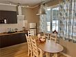 Рассчитан на 8 (3+3+2) человек для семейного отдыха. Две отдельных спальни и лофт (спальное двуспальное место на антресоли), полностью оборудованная кухня, гостиная, сауна, туалет, душ, телевизор, холодильник, микроволновая печь, посудомоечная машина, стиральная машина, утюг. Есть вся посуда!
