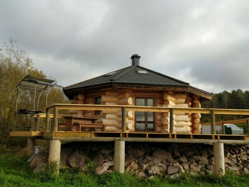 Однокомнатный домик с видом на озеро и панорамным остеклением отлично подойдет для парного кратковременного отдыха на природе. Два основных места.