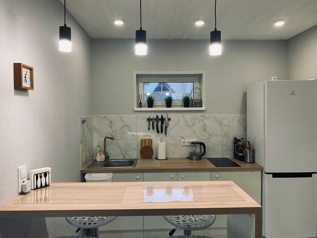Кухня со всем необходимым наполнением: полноценный холодильник с морозильной камерой, индукционная плита, микроволновка, чайник, посуда.