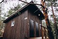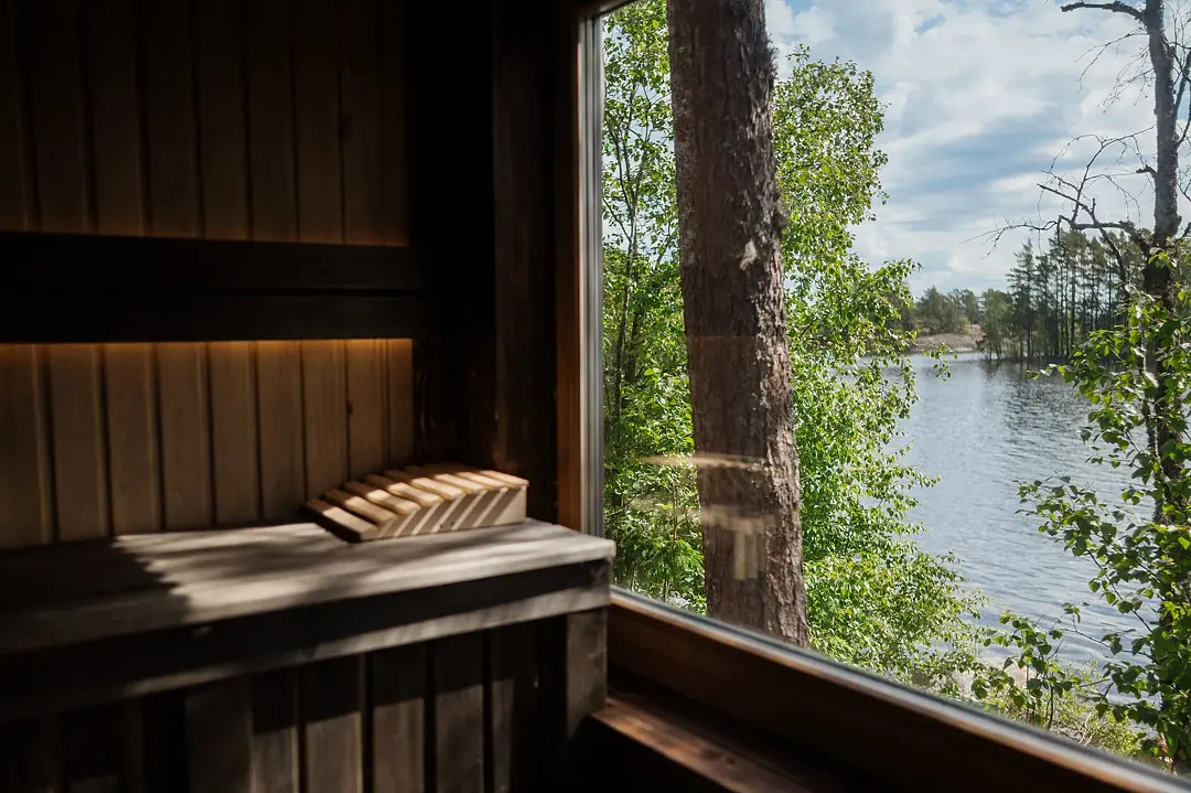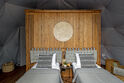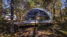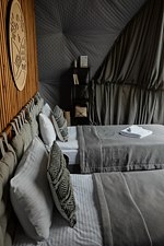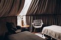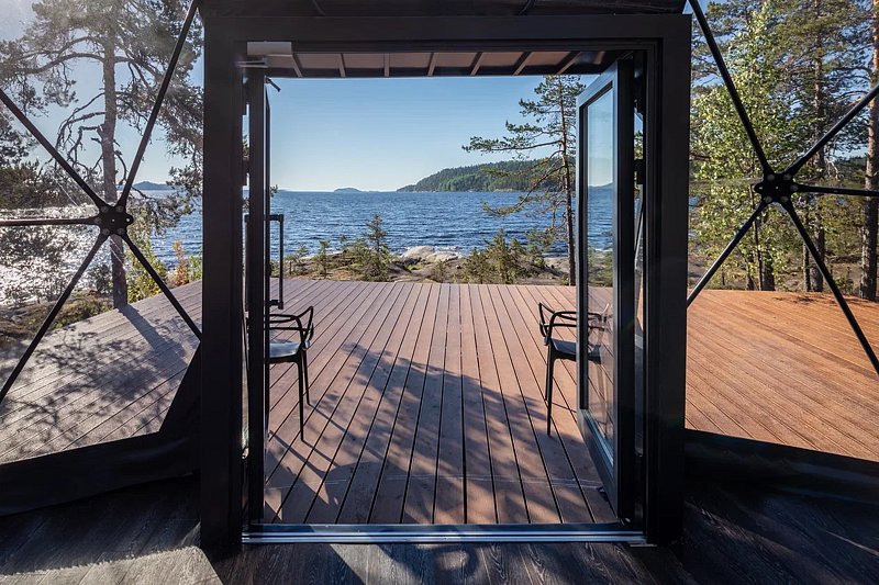 Рассчитан на 2-3 человека. Внутри две удобные нижние кровати или одна большая для пар и дополнительное спальное место наверху, прикроватный столик, два кресла и журнальный стол у панорамного окна с видом на лес и озеро. Также шкаф для одежды, розетки, биотуалет и раковина для умывания. Каждому гостю предоставляется два полотенца.
