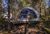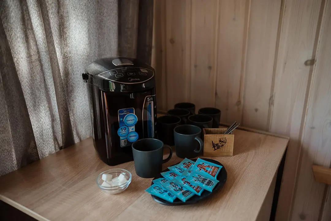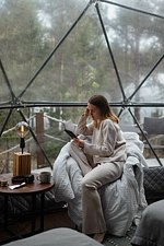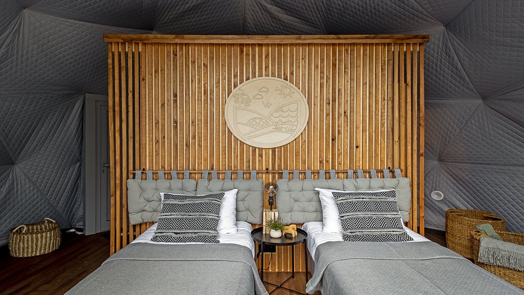 Внутри геокупола две удобные кровати или одна большая для пар и дополнительное спальное место наверху, прикроватный столик, два кресла и журнальный стол у панорамного окна с видом на лес и озеро. Шкаф для одежды, 3 варианта освещения, розетки, биотуалет и раковина для умывания (вода комнатной температуры, без подогрева, ограничение по подаче). Каждому гостю предоставляется два полотенца.