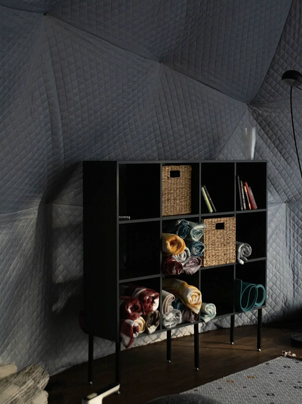 Внутри достаточно места и есть индивидуальные фитнес-коврики, которые можно взять для проведения тренировок и практик. В куполе могут заниматься одновременно около 20 человек.