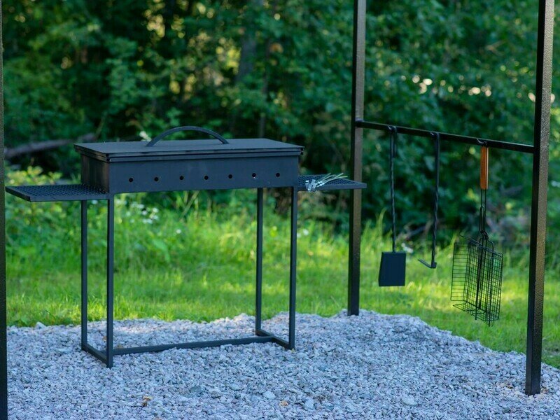 На кухне размещены плита, холодильник, СВЧ-печь, электрочайник и набор необходимой посуды. Для приготовления блюд на свежем воздухе установлен мангал.