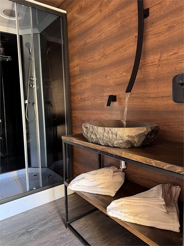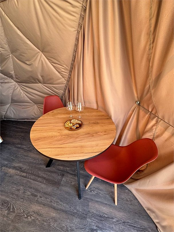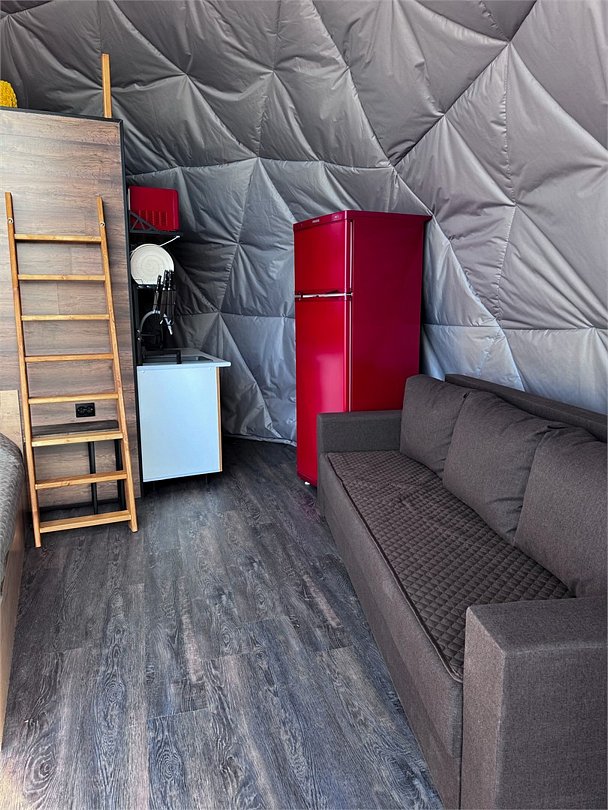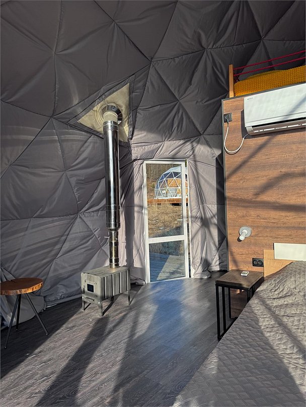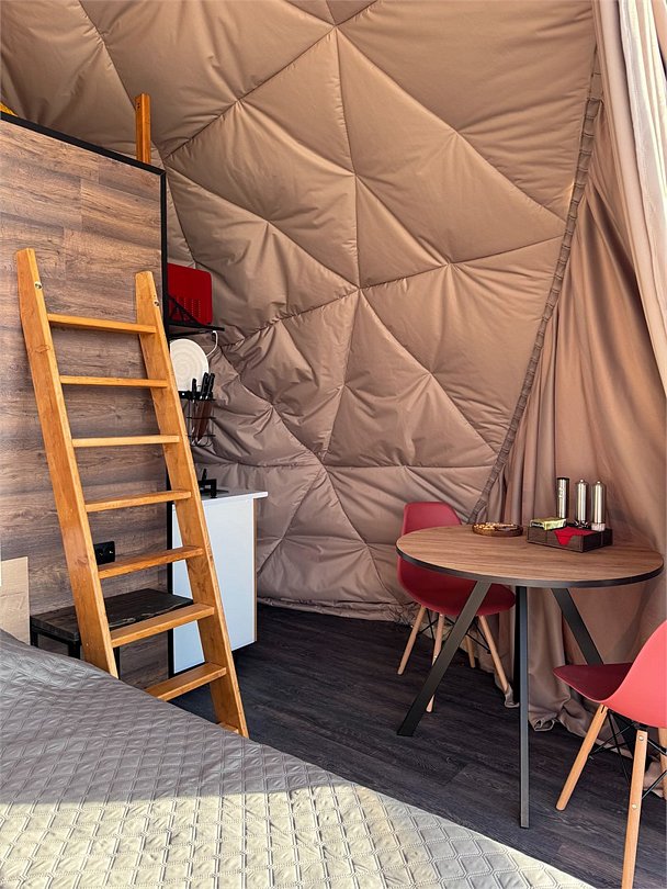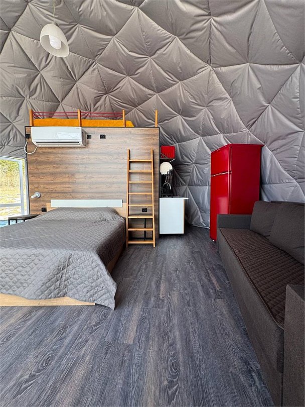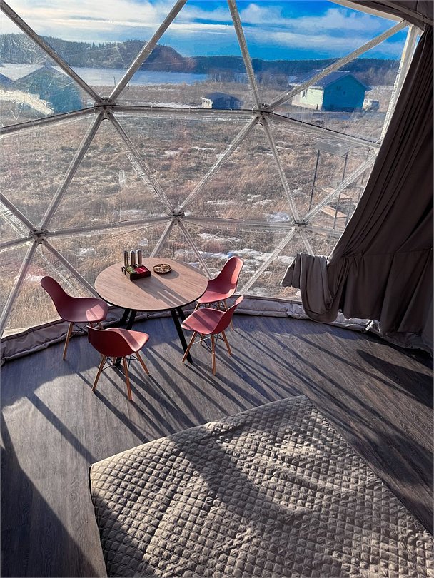 Представьте себе уединенный купольный домик, словно сошедший со страниц сказки, где современный комфорт гармонично переплетается с первозданной красотой природы. Внутри вас ждет уютная, но функциональная кухня, оборудованная всем необходимым для приготовления вкусных блюд: от компактного холодильника и микроволновой печи до чайника и полного набора кухонной посуды. Центральное место занимает удобная двуспальная кровать, обещающая безмятежный сон, а для путешествующих с детьми или друзьями предусмотрена дополнительная односпальная кровать. Обеденная зона представлена столом со стульями, где можно насладиться едой или просто выпить чашку кофе, любуясь открывающимся видом. Современная душевая и туалет обеспечивают максимальный комфорт. Но главное сокровище этого домика – панорамный вид на величественное Ладожское озеро, простирающееся до самого горизонта. А на террасе, обставленной удобной мебелью для отдыха, вы сможете в полной мере насладиться свежим воздухом и умиротворяющей атмосферой, наблюдая за игрой солнечных лучей на водной глади.Услуги и удобства
