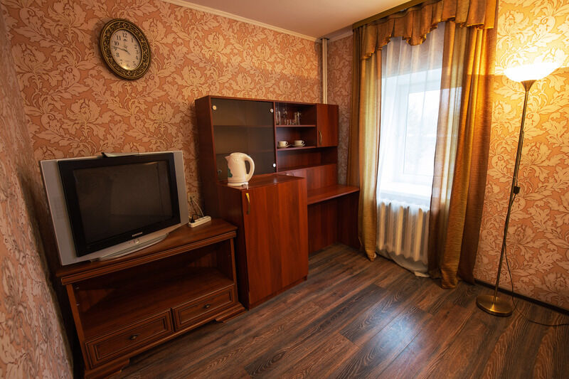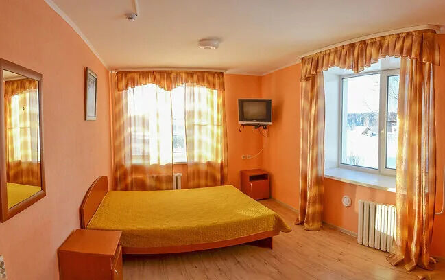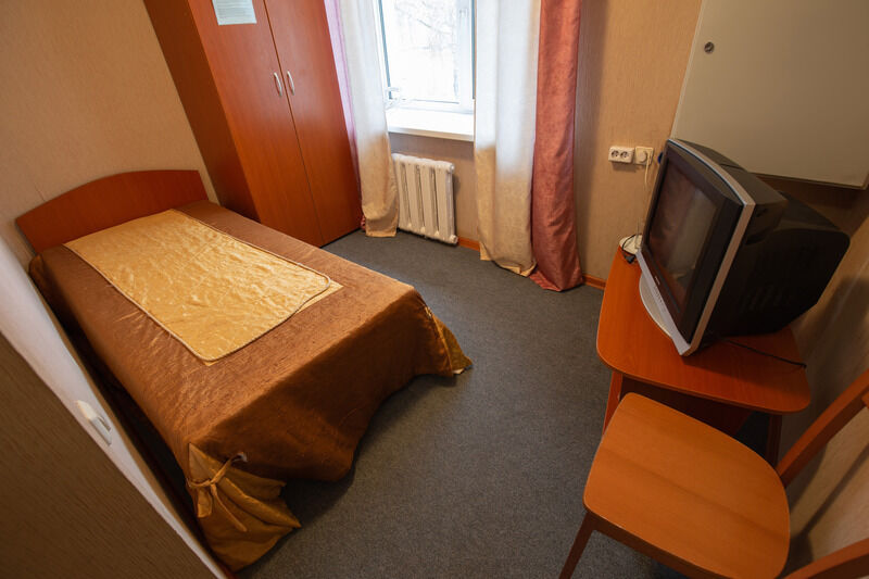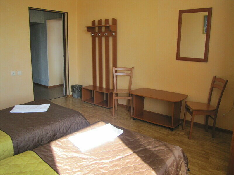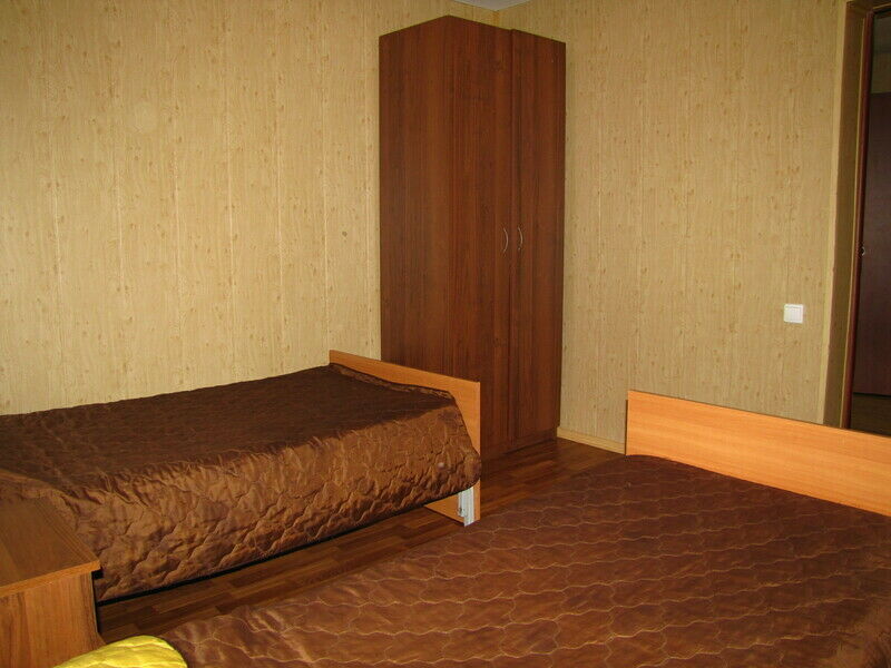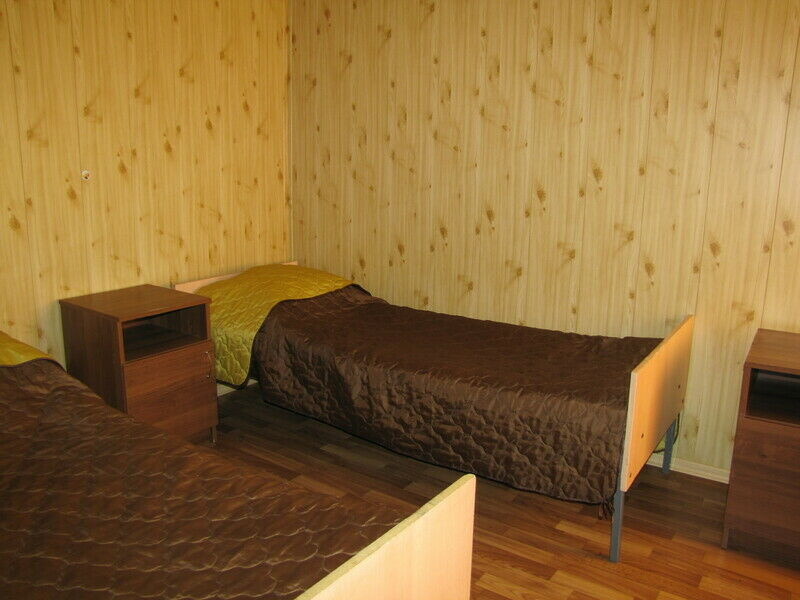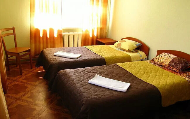 Стандартный номер на двоих с двумя полутороспальными кроватями. Санузел с душем, телевизор, холодильник на этаже.