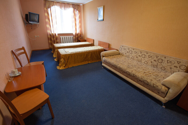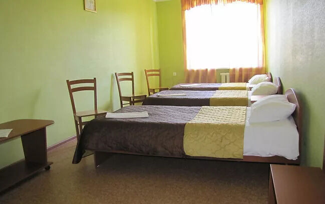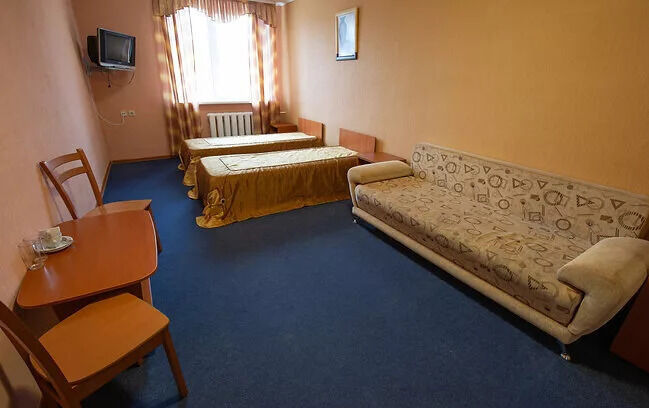 Стандартный номер на троих с тремя полутороспальными кроватями. Санузел с душем, телевизор, холодильник на этаже.