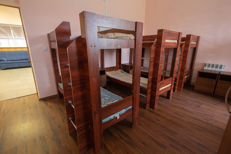 Стандартный номер на четверых с четырьмя полутороспальными кроватями. Санузел с душем, телевизор, холодильник на этаже.