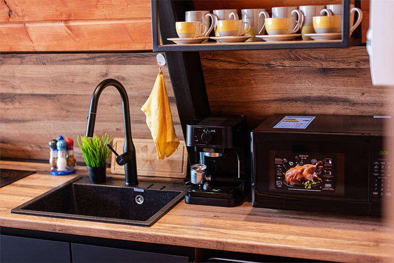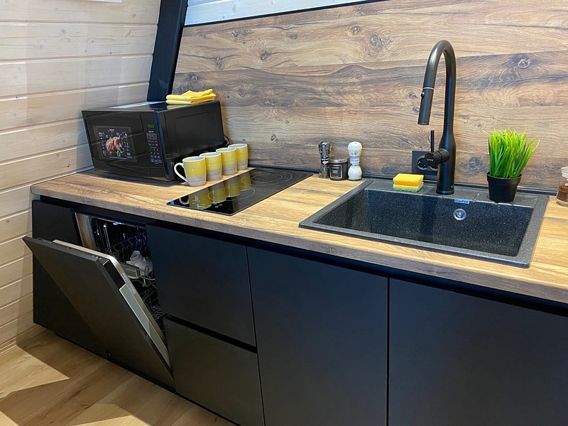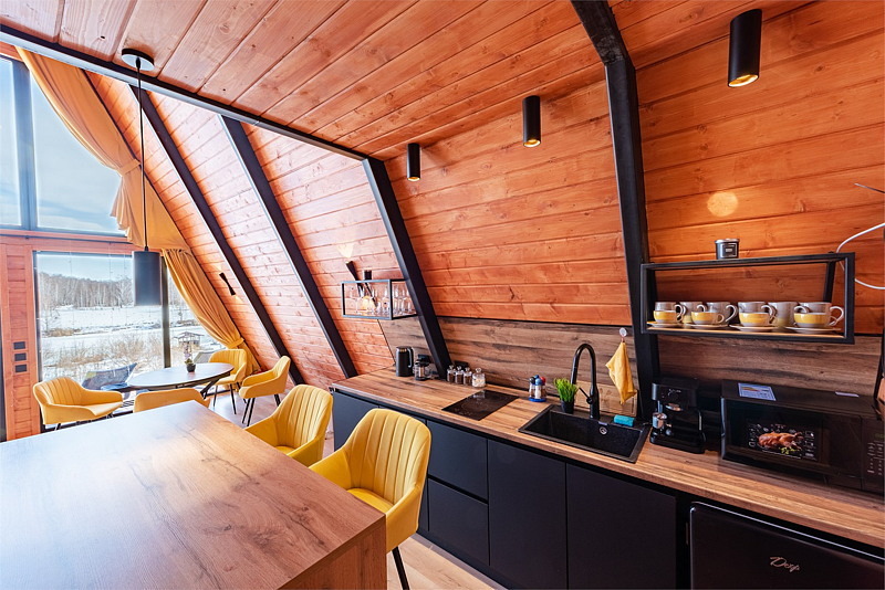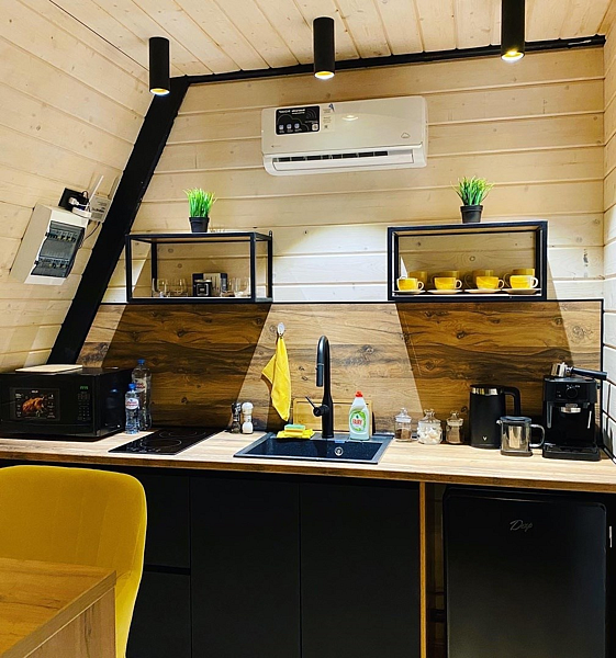 В домиках предусмотрено кухонное пространство с электрической плитой, микроволновой печью, чайником и посудой. Рядом с домиками есть террасы с мебелью, где можно наслаждаться рассветами и закатами. У каждого домика есть зона для барбекю. На территории глэмпинга есть общая зона с костром, где можно погреться и петь песни под гитару. Вдоль реки расположен пляж для загара. Для автомобилей предусмотрена бесплатная парковка.