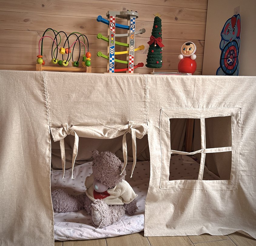 Двухъярусная кровать, письменный стол, настольный футбол, игрушки.