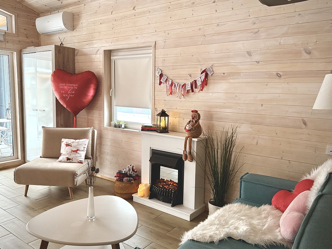 Вас будет ждать уютный тёплый коттедж, в котором есть всё необходимое для отдыха: удобная мебель, кухня, санузел, техника и Wi-Fi, а наличие домашнего проектора позволит погрузиться в атмосферу фильма.