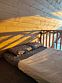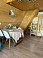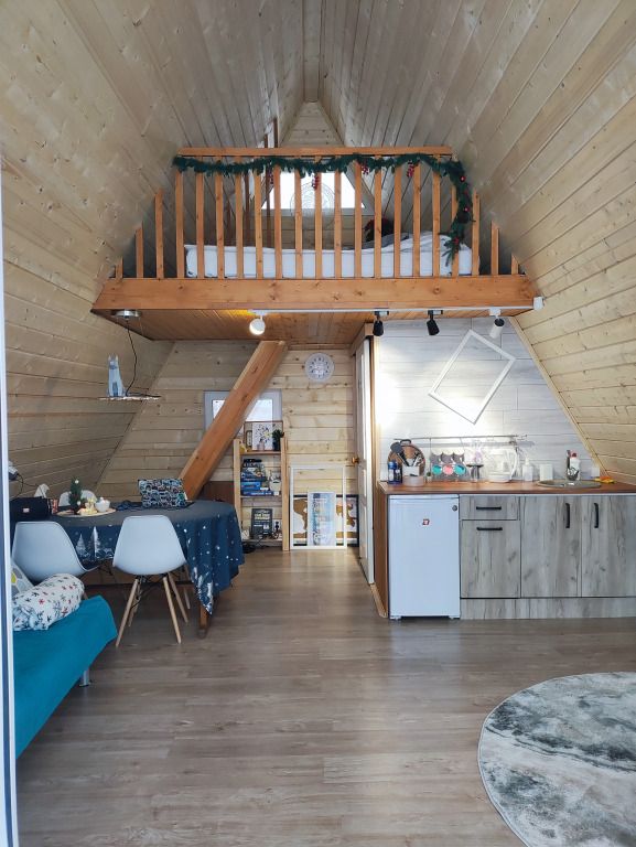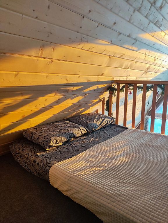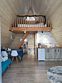 В домике предусмотрено 4 спальных места: двуспальная кровать на антресольном этаже и двуспальный диван на первом этаже.