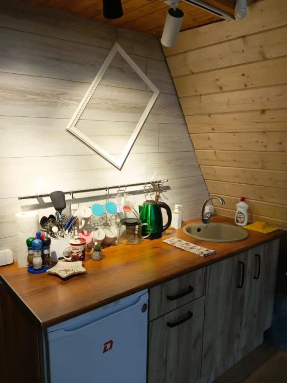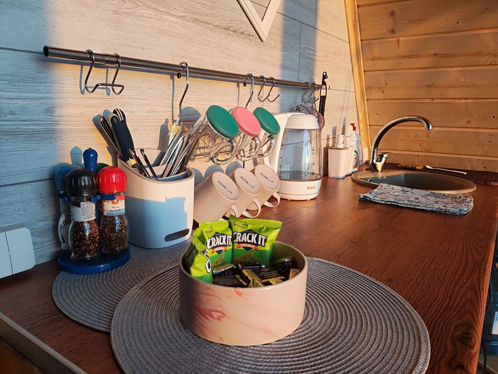 Кухонная зона в доме оборудована всем необходимым (плита, микроволновая печь, чайник, холодильник с морозильником) и современными посудой.