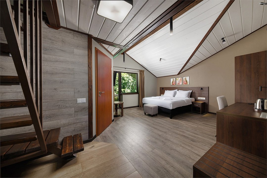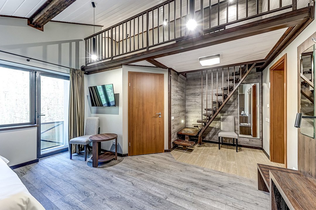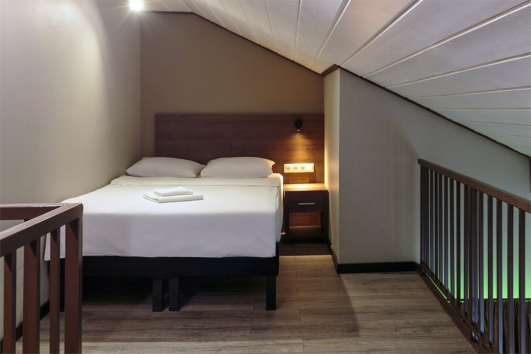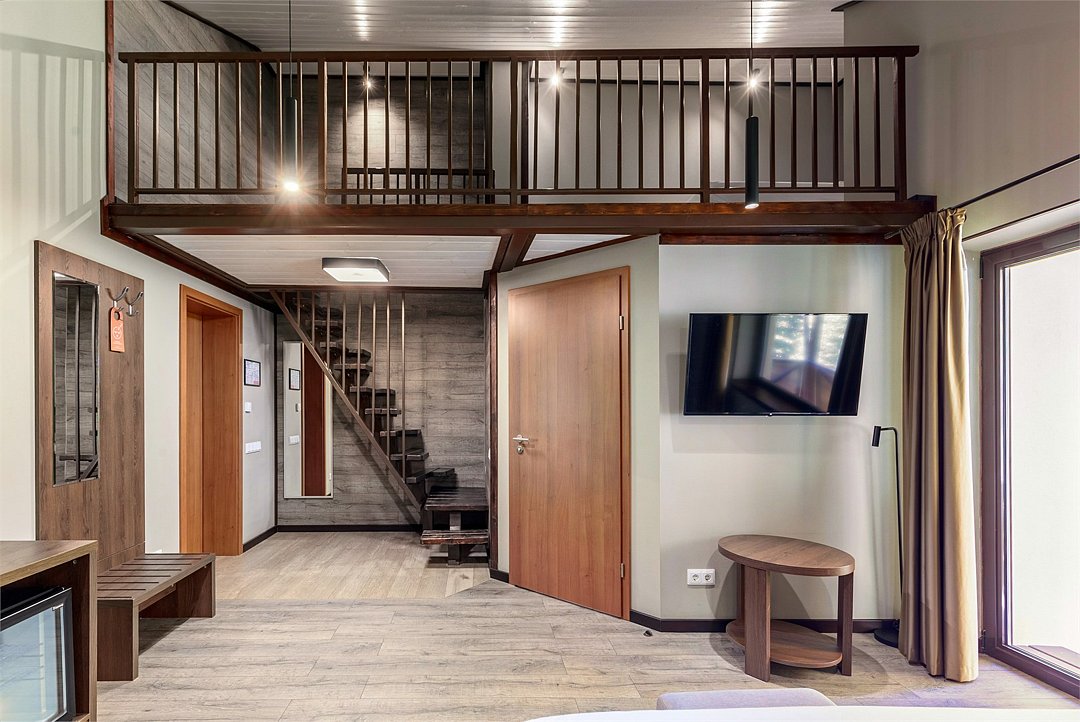 Комфортный номер категории Семейный делюкс с сауной. Возможно размещение на одной двуспальной кровати или двух раздельных. Также в номере есть второй ярус, на котором расположена двуспальная кровать. Идеальный вариант размещения для семей с детьми. На балконе вы сможете насладиться чистейшим воздухом соснового леса. Элементы декора номера могут отличаться от тех, что присутствуют на фото.Услуги и удобства
