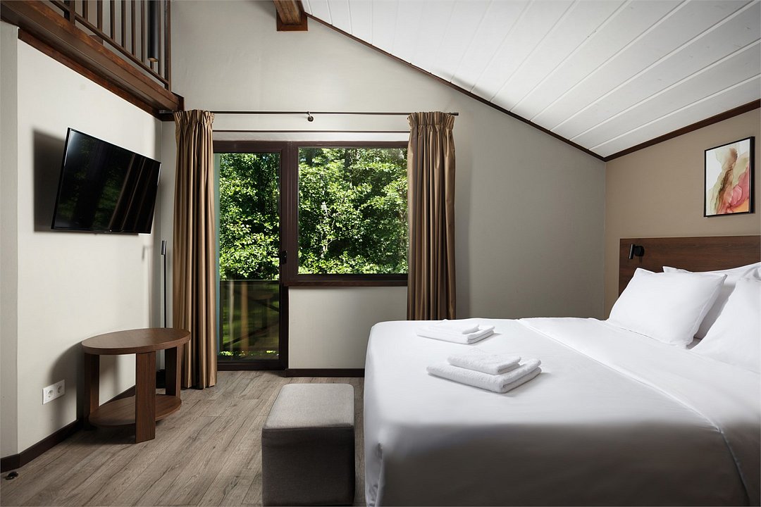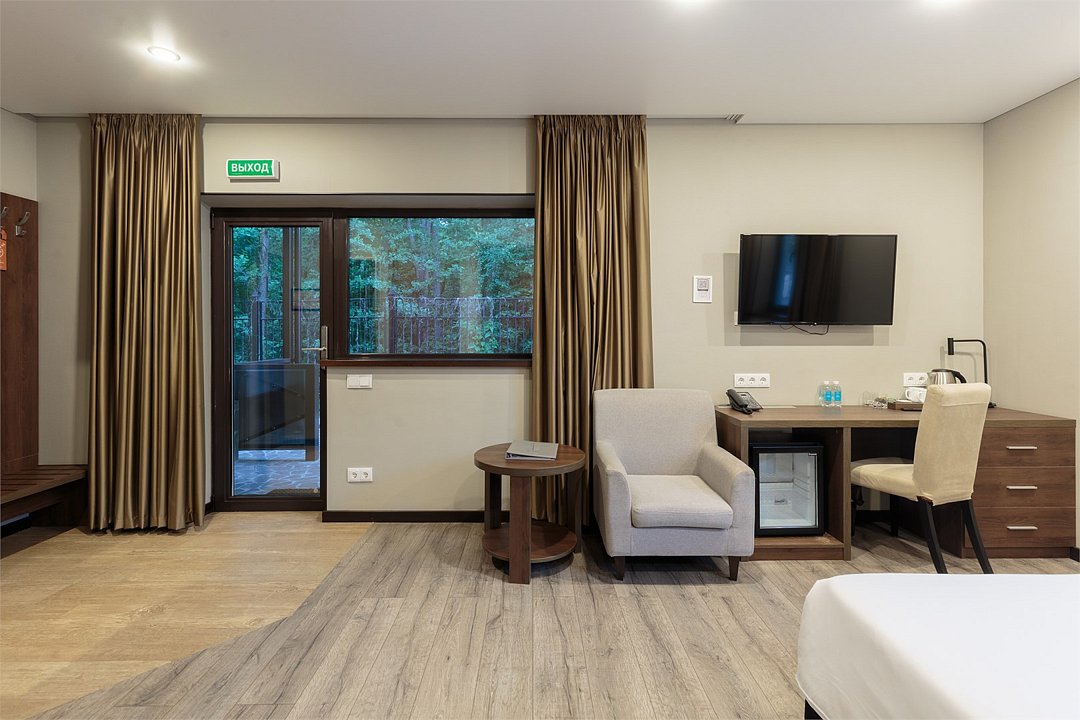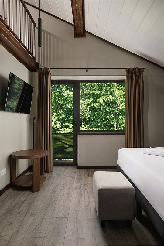 Wi-Fi, телефон, светильник, настольные лампы, фен, вентилятор, душевая кабина, теплый пол, банные полотенца, тапочки, косметические средства, балкон, балкон с красивым видом, две односпальные или большая двуспальная кровать, шкаф для одежды, письменный стол, багажная тумба, зеркало, мини-бар, чайный набор, обслуживание номеров, сейф, чайник, раковина, питьевая вода, отопление, кресло, стаканы, стул, туалет, телевизор с плоским экраном, мини-холодильник, номер для некурящих, вид на лес, вешалки-плечики, мыло, затемняющая штора, можно с питомцамиВ гостиничном номере