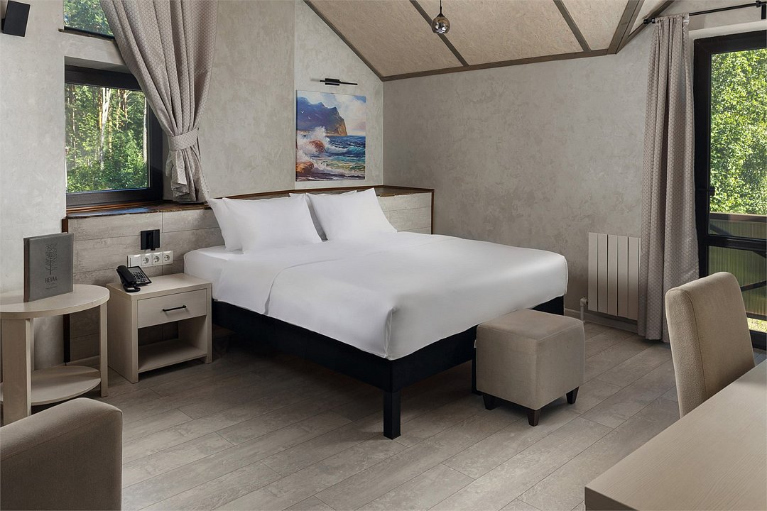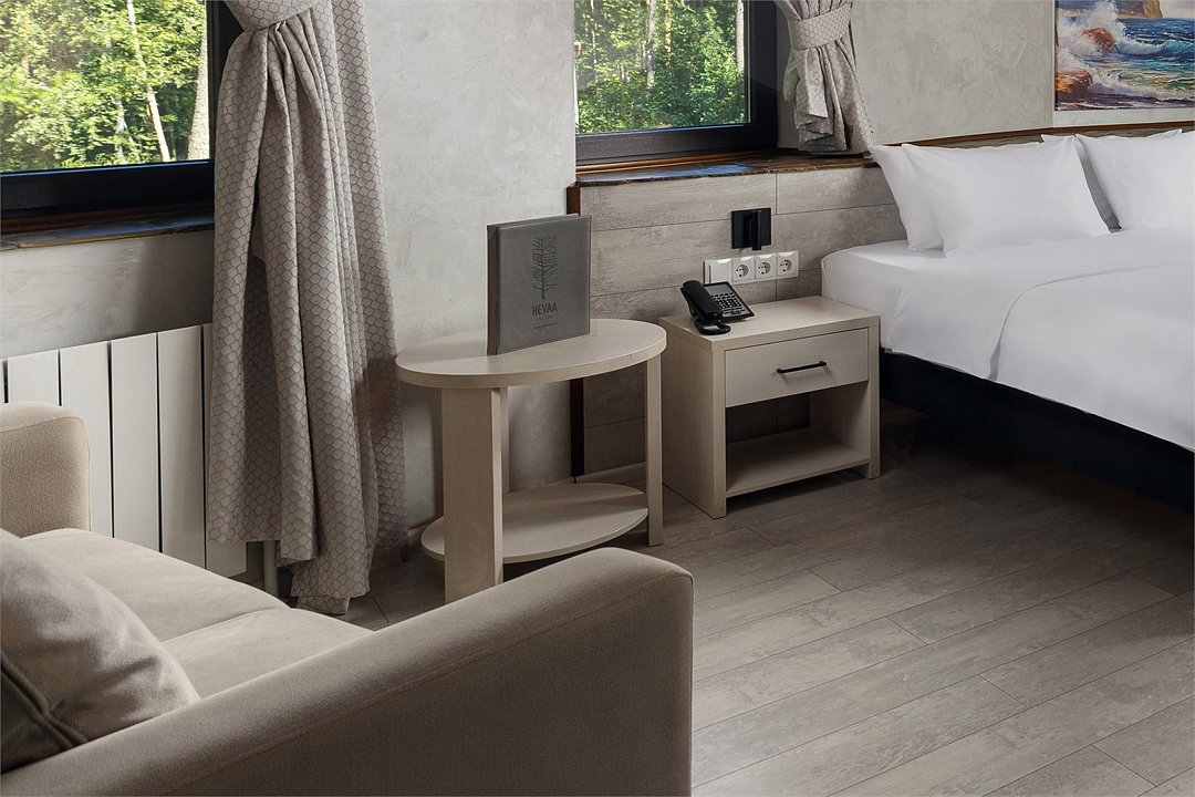 Путешествие с паройВ целом всё круто, но с конкретным минусомВ этот отеле была в августе: с четверга по субботу. Территория отличная: вид, чистота, парковка. Дают в аренду велосипеды, сапы, лодки. Рядом шикарный лес с тропинками и дорогой. Не устроило, что с пятницы на субботу не обслуживали гостей в гриль-баре (хотелось вечером поужинать). Предлагали только приобрести напитки ссылаясь на плохую дождливую погоду при которой кухня не работает! Альтернативы этого ресторана в шаговой доступности нет и поэтому я и мой спутник остались голодные и без впечатлений от вечера пятницы. Возможно следовало бы заранее предупредить персонал (в стоимость номера входит только завтрак), но так как данное заведение позиционирует себя рестораном не только для гостей Hevaa, но и для другой публики, которая специально приезжает с округи откушать (блюда действительно вкусные), считаю это большим минусом данной базы отдыха. Получается, что в дождливую погоду (вдруг так случилось) там и покушать не получится!